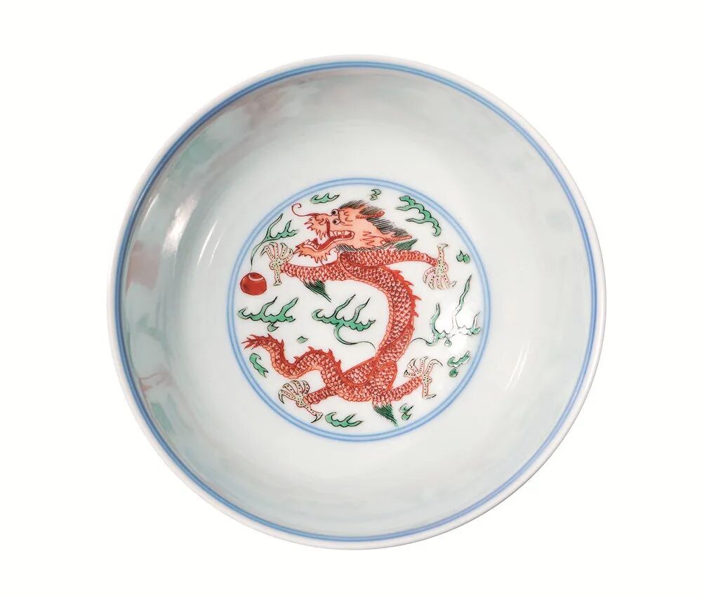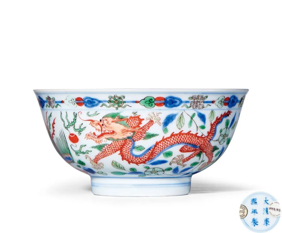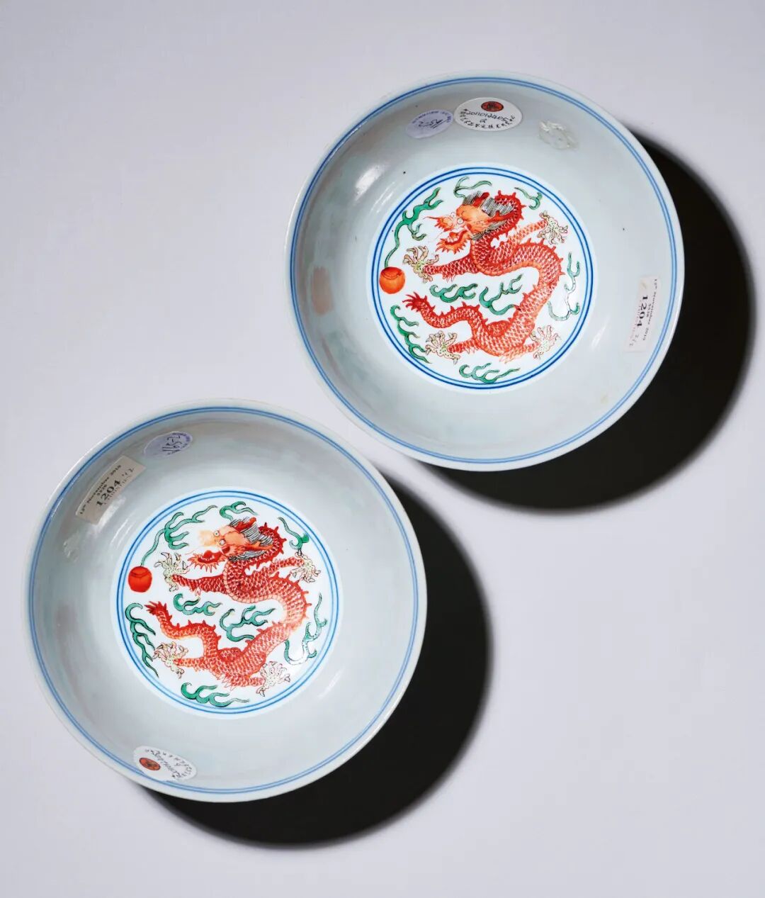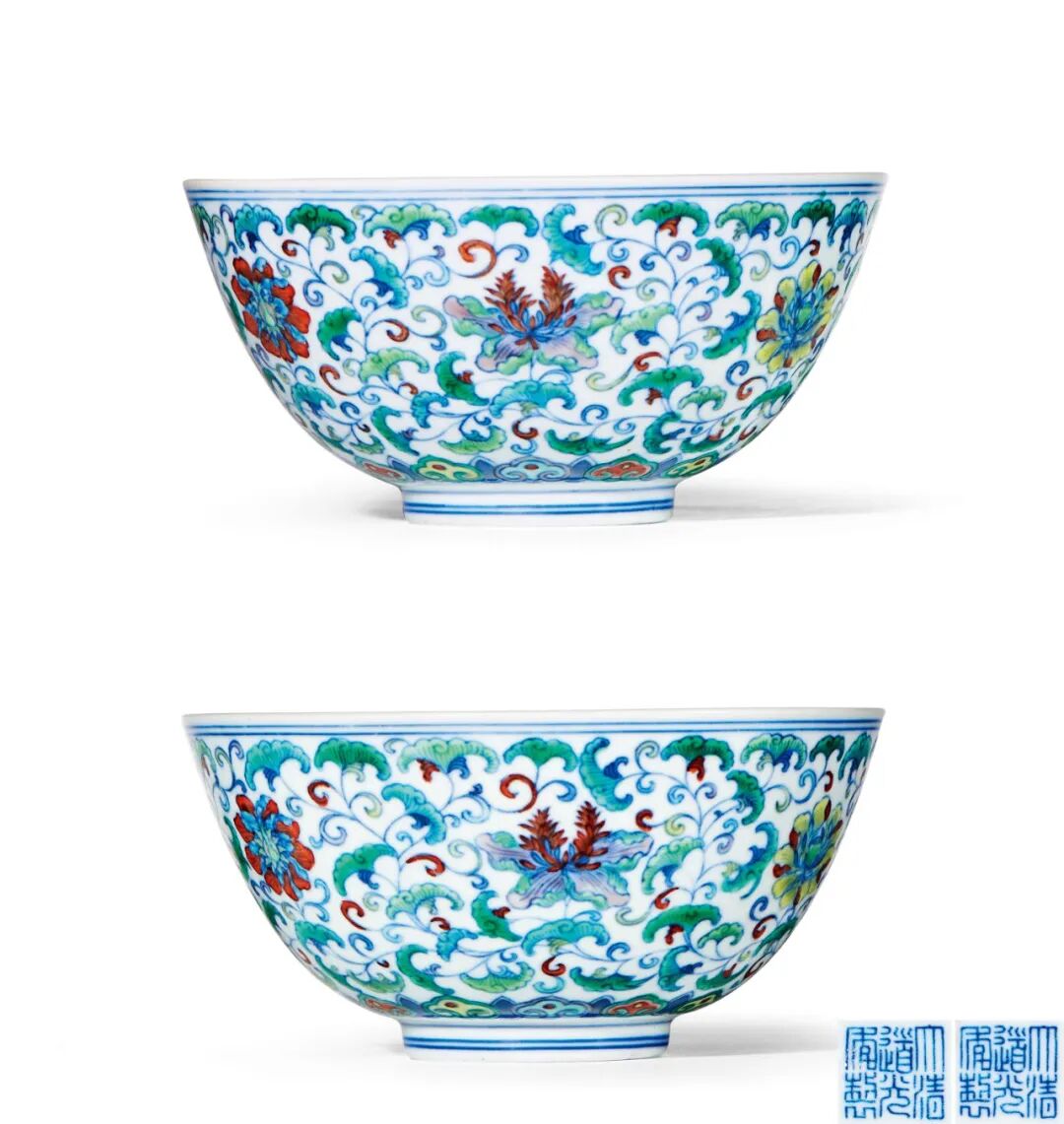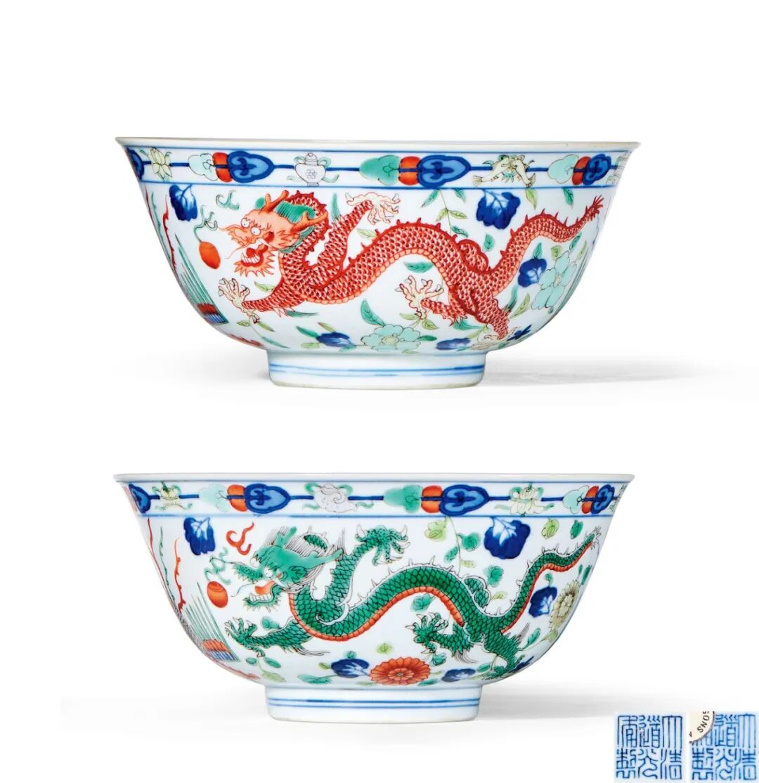 拍品估价:80,000 - 120,000 人民币此对拍品敞口,深弧腹,圈足。通体施以豆青釉,碗壁用矾红绘制五组团凤纹,凤鸟展翅,凤目尖喙,羽丰尾长,仪表威仪。矾红是陶瓷低温釉上颜料,明代嘉靖时,御器厂以矾红釉取代铜红釉。到清乾隆时,矾红的制作技术有了很大的进步,色泽鲜艳,华丽凝重。此对碗造型端庄稳重,图案规整,绘画生动,釉色纯正,与纤细的纹饰相衬,分外脱俗,寓意吉祥,是艺术及历史价值极高的收藏品。拍品估价:100,000 - 200,000 人民币记录:南肯辛顿佳士得,2010年11月12日,编号1204此对碗胎质细腻,釉质润泽,釉面匀净,侈口,口沿以青花绘饰弦纹。曲腹较深,圈足,圈足外亦饰弦纹,圈足内书“大清道光年制”六字三行篆书款。碗内底以红彩绘出五爪龙戏宝珠图案,龙身周边青焰围绕,碗外部近口沿处以紫、黄、绿彩绘一周八宝纹,以青花五彩绘出双龙双凤,基本呈中心对称,双龙主体颜色分别以红、绿彩绘出,双凤振翅凤首朝下,龙凤身边装饰以缠枝花卉,精美绝伦。龙凤成双成对,寓意吉祥。此类碗是清代宫廷举办大仪式中的御用膳碗,始见自康熙朝,后成官窑经典器型,每朝必烧,两百年来持之以恒,造型、纹样也基本保持不变。 Lot 1082 清道光 斗彩缠枝花卉纹碗(一对)拍品估价:100,000 - 200,000 人民币参阅:《宫廷珍藏:中国清代官窑瓷器》,上海文化出版社,2003年,页130