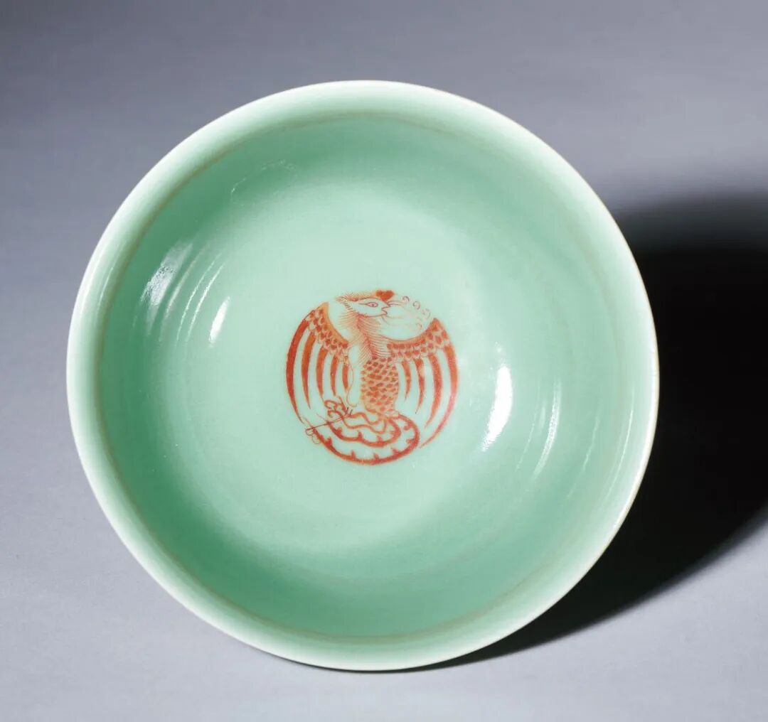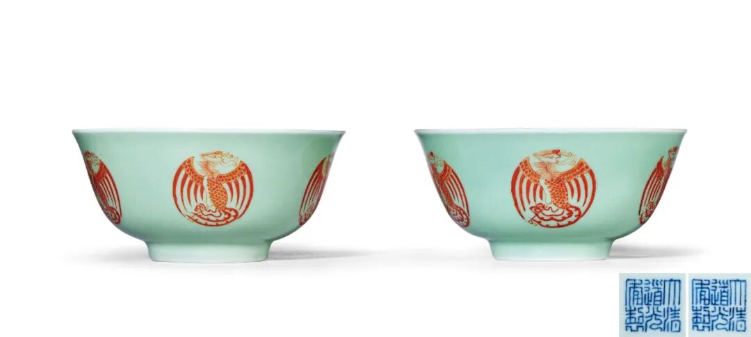 本品撇口弧壁,造型规整。腹部主体通景绘制婴戏图,画面以栏杆为界,巧妙的将十六个童子分为两组,其中一组八个孩童身着兜肚,或执旗,或拈花,围坐于一鱼缸前;另一组小童则穿长衫长裤,或吹唢呐,或擂小鼓,列队于草坪之上。两组童子,一静一动,对比强烈,童趣盎然。人物周围巧妙衬以垂柳、桂花,祥云,使画面显得疏密有致,婴童虽多却不凌乱。碗底心青花书“大清道光年制”六字三行篆书款。本式青花婴戏图碗自乾隆朝成为清代御窑定式,延续烧造至清末。本品为道光所作,胎质细腻,釉色滋润,青花色泽富有层次,绘画细致传神,整体质量不输前朝,其烧造数量却更为稀少,更值珍视。Lot 1080 清道光 豆青釉矾红团凤纹碗(一对)