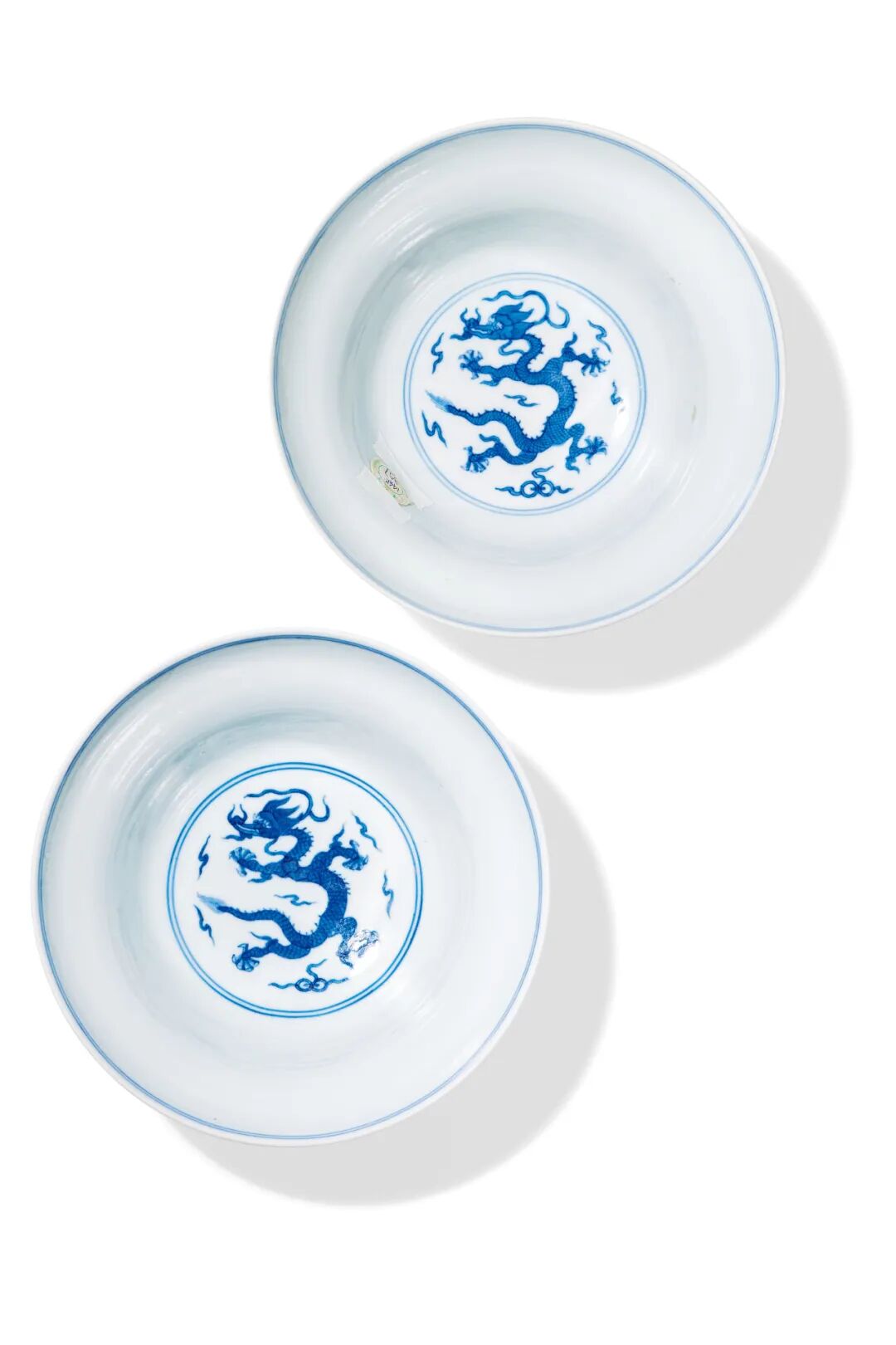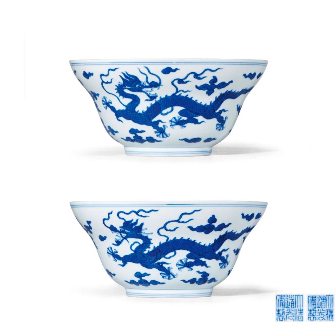 此式斗彩碗创烧于雍正时期,是官窑瓷器对西洋元素的巧妙借鉴,后朝沿续烧造,但均不多见。此对拍品外壁满绘缠枝花卉纹,以青花勾勒枝蔓,彩料填描花叶,布局繁缛,风格华美,为道光官窑上乘之作。Lot 1083 清道光 青花云龙纹折腰碗(一对)