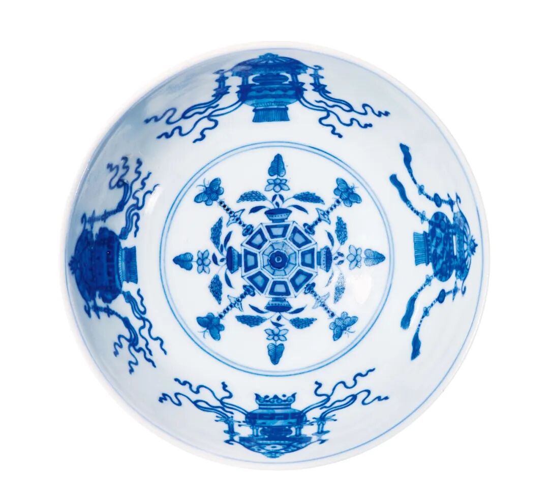 本品造型为清宫制器之典范,敞口微外撇,深腹,圈足,内壁四周分别以青花料绘制宫灯四盏,两两对称,平衡协调,灯穗飘逸,线条流畅生动;外壁以胭脂红色为地,施以轧道工艺。上饰洋彩西洋花卉,四面圆形开光,开光处绘制博古图,如意、宝瓶、四季花卉、宝鼎、五谷、灯笼等吉祥图案寓意“五谷丰登”、“四季平安”、“吉庆有余”。图案对称分布,构图繁密,设色富贵华丽,尽显宫廷节令的喜庆气氛,为清宫上元节用器。底部青花篆书“大清道光年制”六字三行篆书款。拍品估价:80,000 - 100,000 人民币