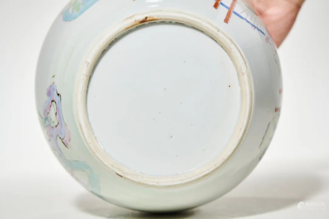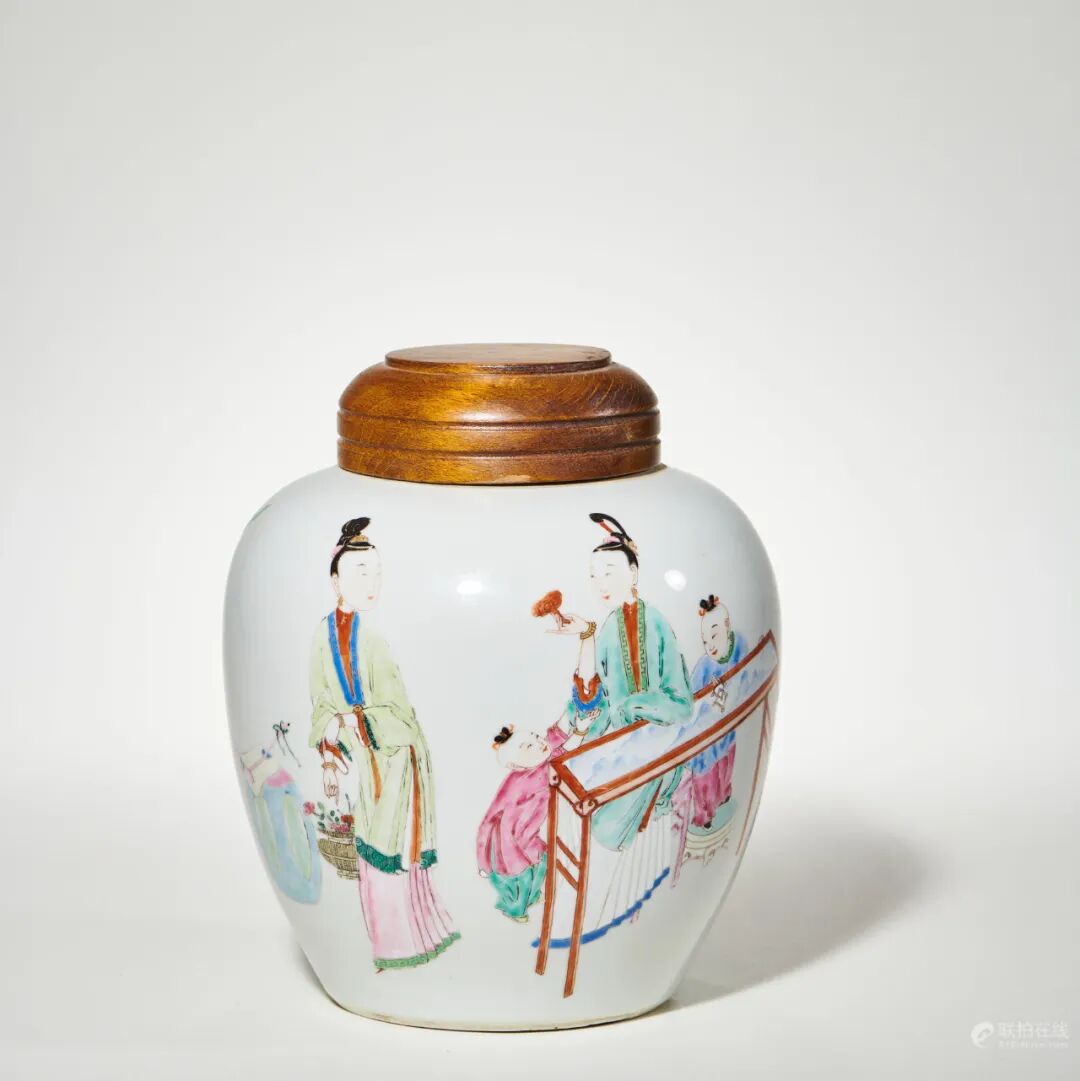 拍品造型饱满丰润,全器罩施玻璃白釉为地,外壁以粉彩绘通景仕女婴戏图,一名仕女回首凝望,另一仕女倚几靠坐,容貌娴雅,姿容优美,手执灵芝,婴孩绕膝,动静相宜。整器绘工精细,生动传神,色彩娇妍,时代特征鲜明。