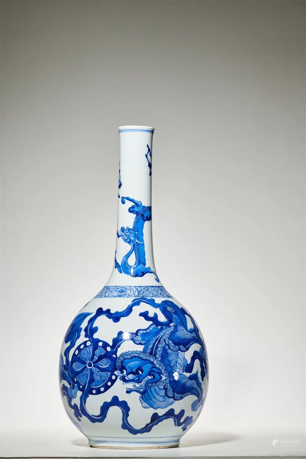 拍品长直颈,溜肩圆腹,腹下渐收,下承圈足。颈部绘一盘区缠绕的夔龙纹,肩部绘一周锦地花卉纹。器腹以青花绘“狮子戏球”纹样,飘带蜿蜒缠绕,狮子肌肉饱满,形态威猛,表情憨态可掬。本器青花发色鲜艳,为康熙时期顶级的“翠毛蓝”发色。整个画面密而不繁,形制规整硕大,为康熙时期陈设佳器。其来源为美国克利夫兰艺术博物馆,为世界知名艺术博物馆,传承有序,极为难得。拍品估价:100,000 - 200,000 人民币
