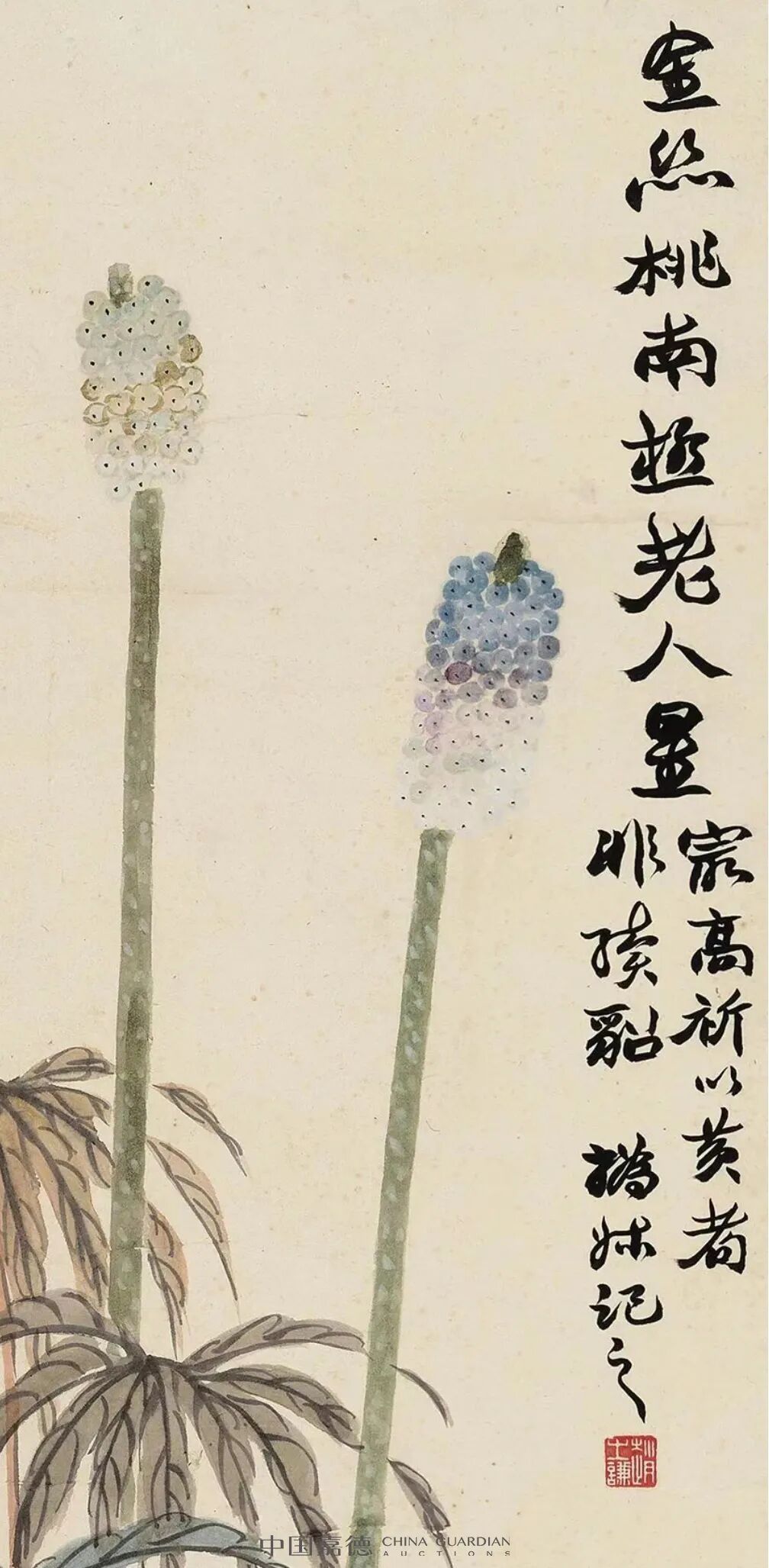 题识:金盘者莲金丝桃,南极老人星最高。祈以黄耇非续貂。撝叔记之。