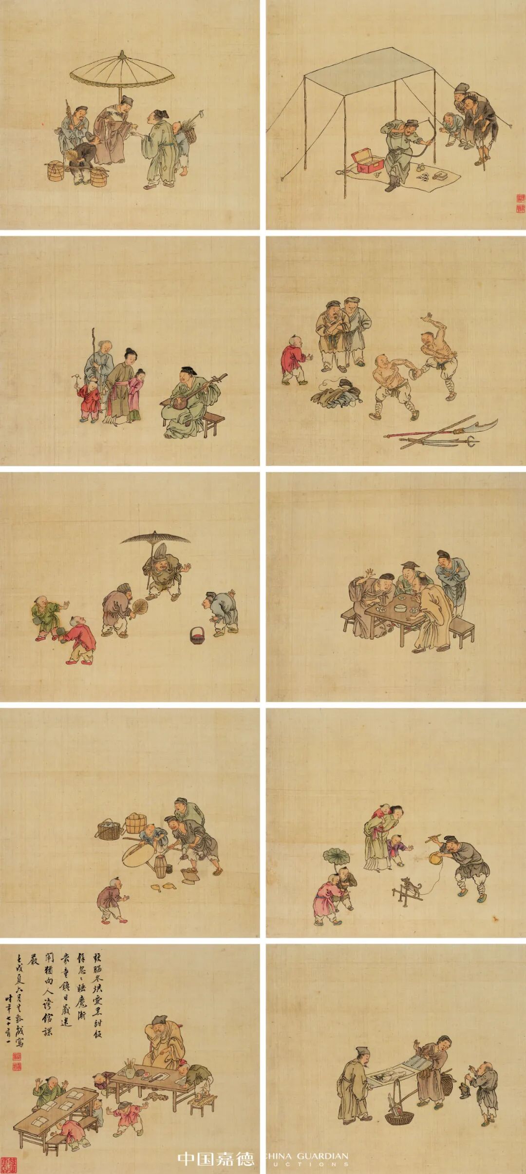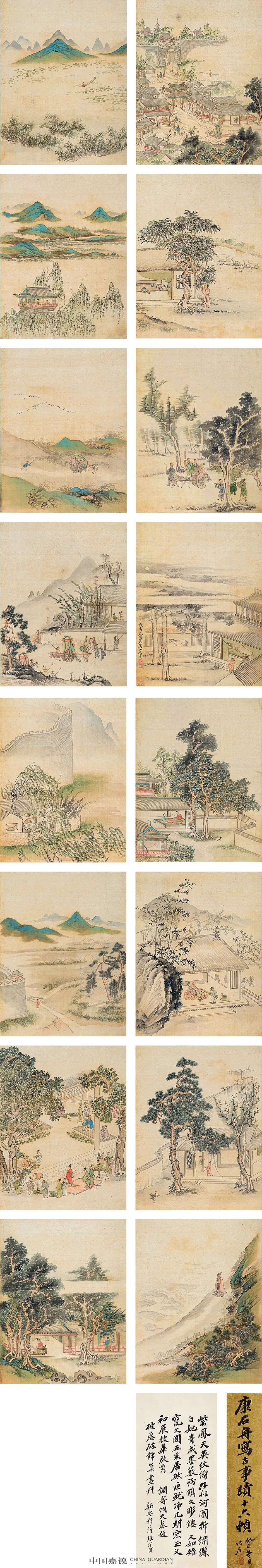 3. 康焘为清代雍乾时期画家,一生以孝闻名乡里,精工人物绘画,兼善山水花鸟。《人物故事图册》原为海上画家程璋所有,后入藏于上海博物馆,并先后四次著录于《中国古代书画图目》与《中国古代书画鉴定实录》等权威出版物中。康焘存世作品不多,精工册页尤少。此作与市场所流通的绝大多数康焘作品相比而言,可谓上佳之作。全册构图巧妙,用笔工整流畅,人物形象古朴静逸,多为布衣装扮,阳春烟景,城郊踏游,春日里的畅快舒朗之情跃然笔下。