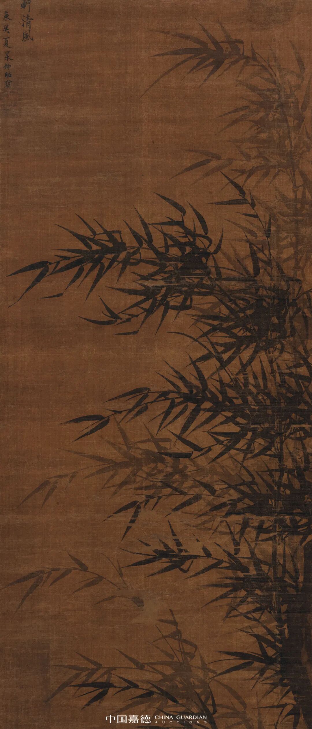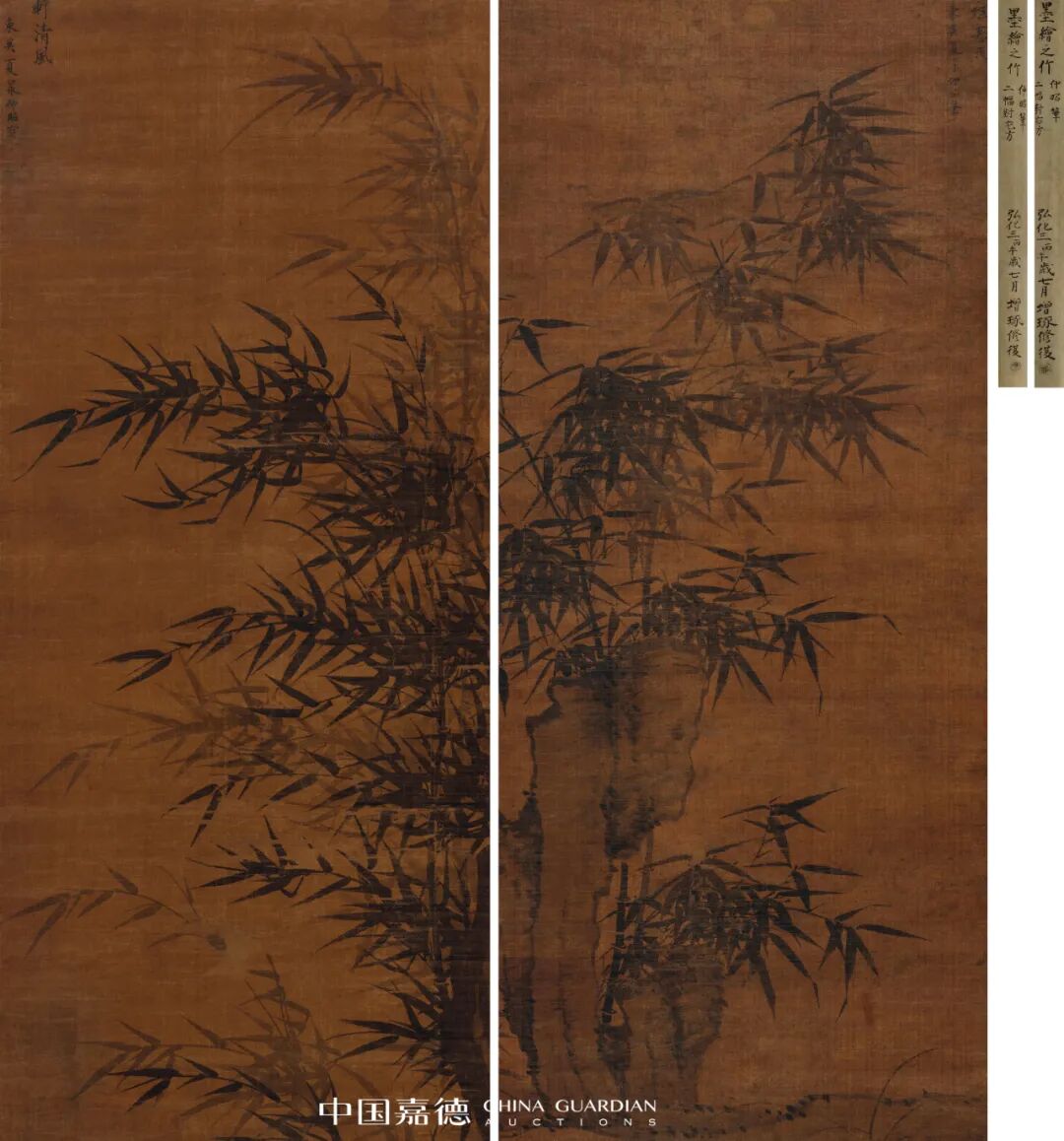 夏昶笔下之墨竹,从画史而言,呈上启下,影响深远。此对屏分别绘动静各异之墨竹,静者如沐浴春雨,动者似在风中摇曳。简繁有致,墨韵生动。画幅上部左右处各书有“□轩清风。东吴夏昶仲昭写。”、“(西)垣春雨。东吴夏昶仲昭笔。”两个落款的第一个字皆因年代久远而剥落。陆时化《吴越所见书画录》卷四著录有夏昶《西垣春雨》一幅,与此同题。钤印有“仲昭”一印余印漫漶不辨。画轴有签题:“墨绘之竹,仲昭笔。”、“弘化丙午三岁(1846)七月增琢修复。”可知此作一直递藏于日本,为“古渡”藏品。