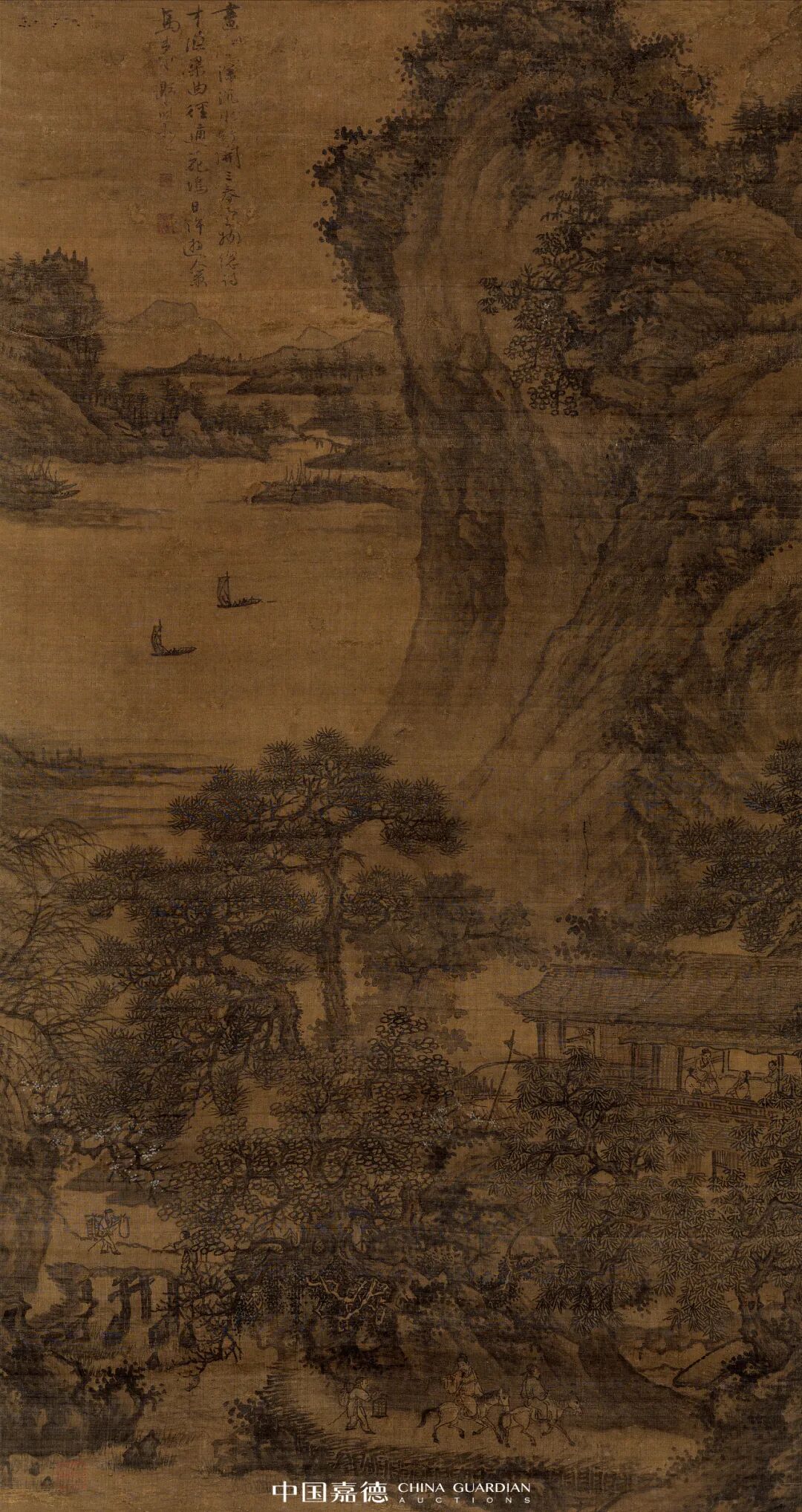 谢时臣,号樗仙,明嘉靖、隆庆时吴门人,山水画家,法沈周而以雄豪恣肆称。此图写春山游骑,在茂林虬松之间,过板桥渡涧而来。林木深处,桃柳掩映之间有客栈酒家敞门迎客。屋后危岩高耸,湖天空阔。画笔沉郁,气象壮阔,观其画法,在苍莽中仍有秀润之气溢出,当是其中年所作。与其晚年中每露霸悍之习者有所不同。故佳。