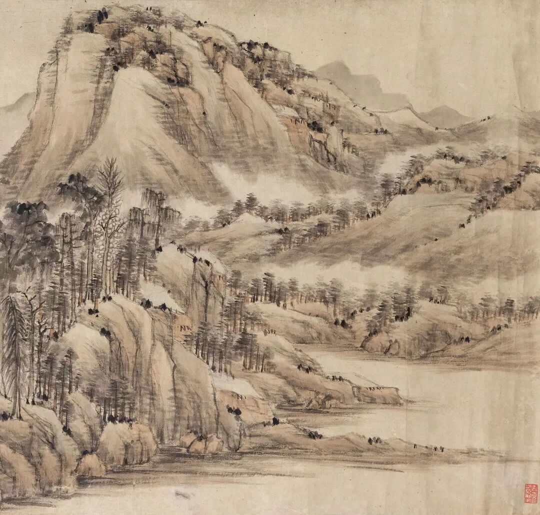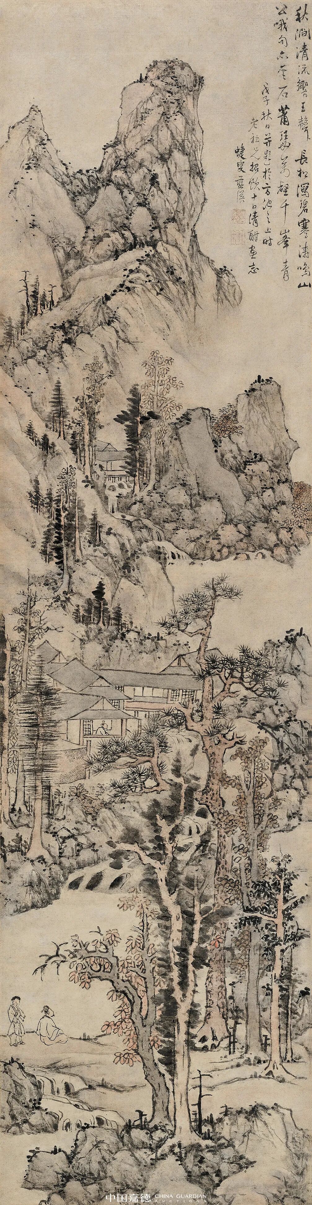 蓝瑛,明晚期浙派画一代大家,与浙派开山祖戴进一样,既取法于南宋院体,亦上溯北宋及元代诸大家。而蓝瑛更能取法大痴、云林之长,故笔底蕴藉,非张路、汪肇辈所能比拟。此轴即以黄公望笔法为之,秋林列岫,幽谷泉流,取景高巍,笔墨拙厚,而气息冲淡。戊子为顺治五年,蓝瑛六十三岁,是其盛年用意之作。