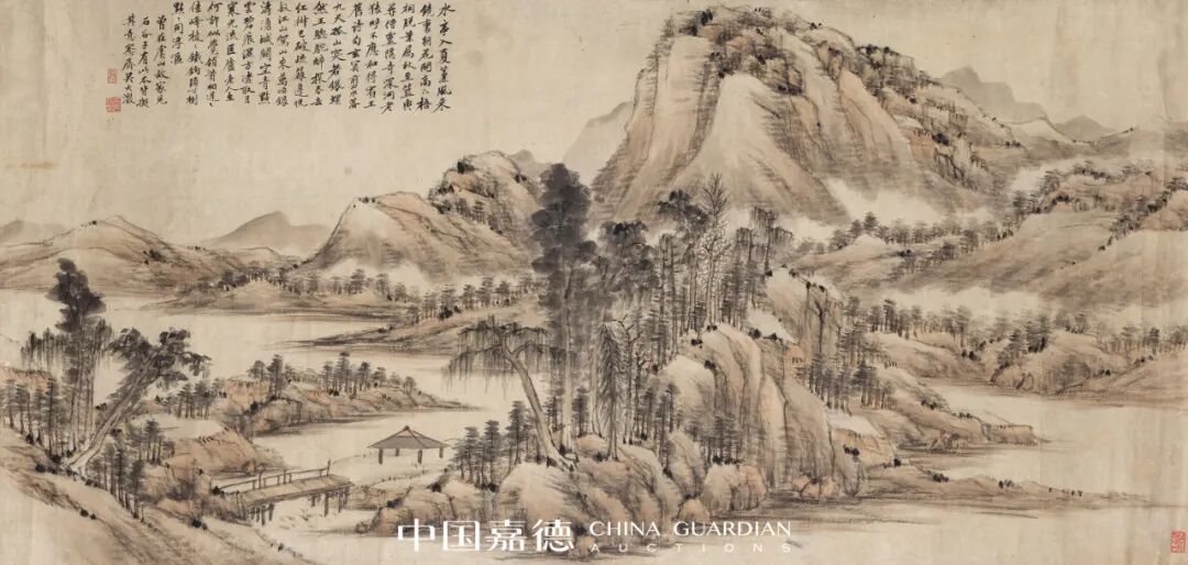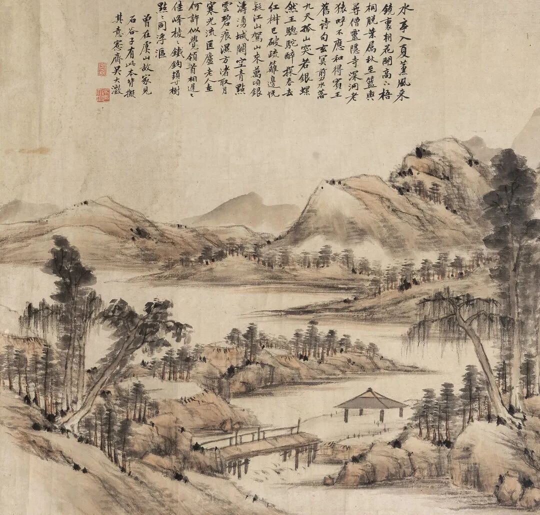 题识:水亭入夏薰风来,镜里朝花开高下。梧桐脱叶属秋至,篮輿寻僧灵隐寺。深洞老猿呼不应,和得宾王旧诗句。玄冥剪水落九天,孤山突若银螺然。王骢驼醉探春去,红椒已破疏篱边。恍疑江山驾山来,万顷银涛涌城阙。空青点云碧痕湿,方渚取月寒光流。匡庐老人在何许,似觉领首相迟迟。佳峰棱棱铁钩锁,寸树点点同浮沤。曾在虞山故家见石谷子有此本,背拟其意。愙斋吴大澂。