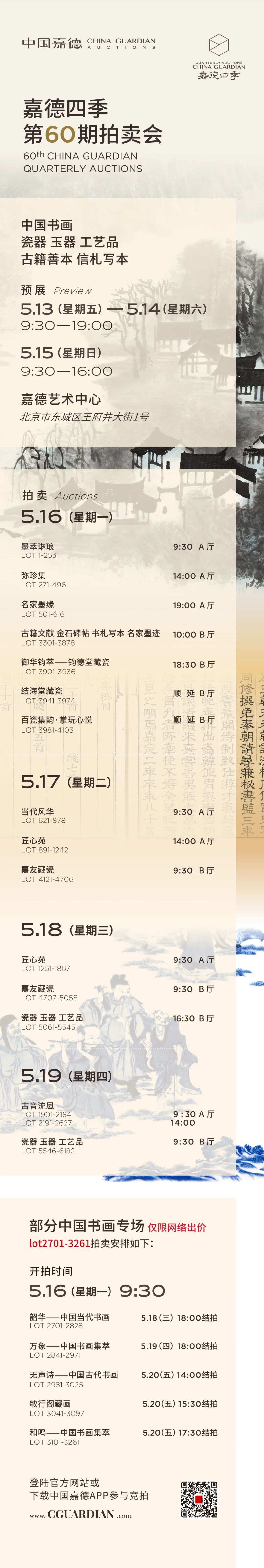 拍卖会于5月13日至15日预展,5月16日至20日拍卖,展拍地点均在嘉德艺术中心。线上专场可扫码下载嘉德APP参与竞拍。