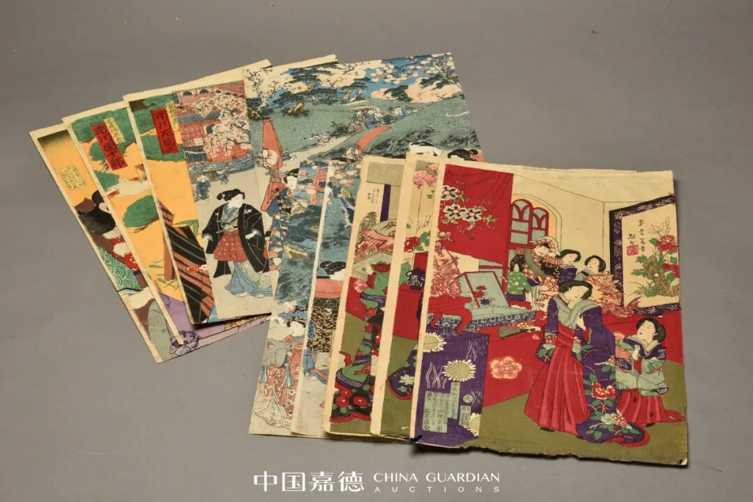 木刻版画是东方版画的重要组成部分,在中国出现了以《十竹斋书画谱》、《芥子园画传》为代表的木刻套色版画作品,在日本则出现了以浮世绘为代表的木版画创作,且颇具日本本土特色。此次所得《浮世绘三种》为近代日本浮世绘名家丰斋香朝楼、歌川国贞、杨洲周延等人绘刻,异域色彩浓郁,令人耳目一新。