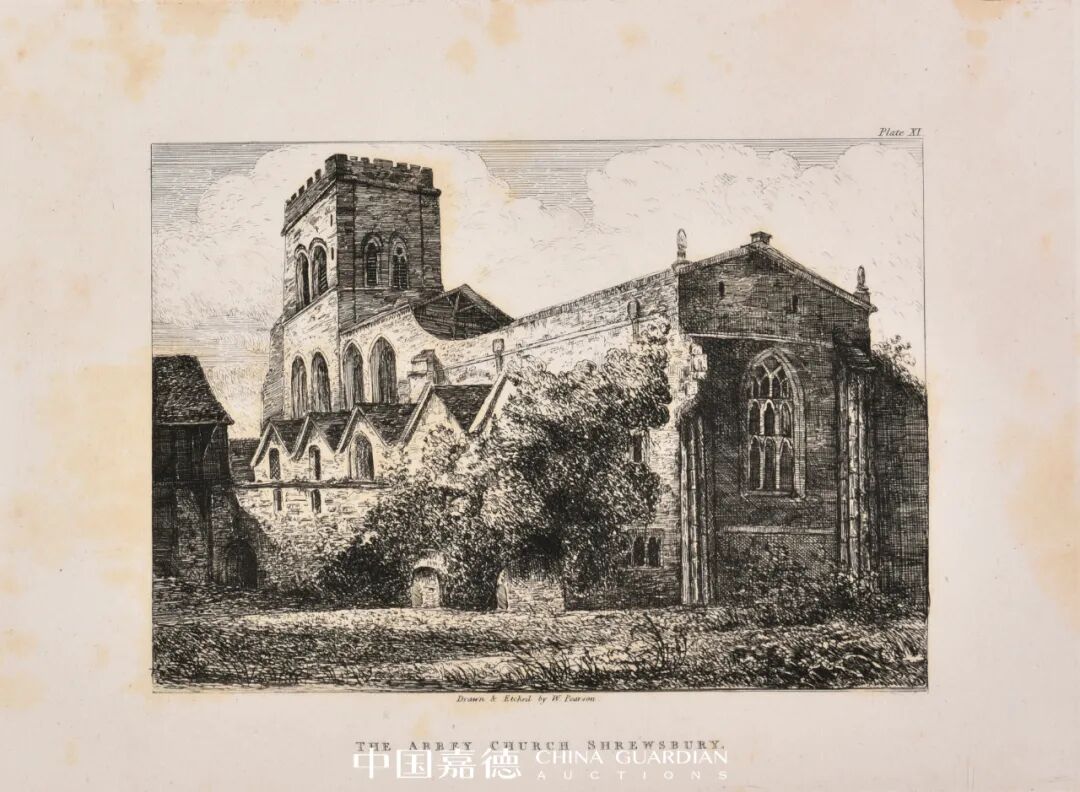 常玉所采用的蚀刻版画技术来源于西方,是一种有500多年历史的版画技术,由铜或锌制成的金属板,以及能在金属上腐蚀绘画的酸,用复杂的方法产生各种效果。蚀刻版画复杂,消耗较多,因此较普通版画价格更加昂贵。此次上拍的《英国建筑蚀刻版画集》内收英国建筑蚀刻版画40幅,皮面精装,品相上佳。