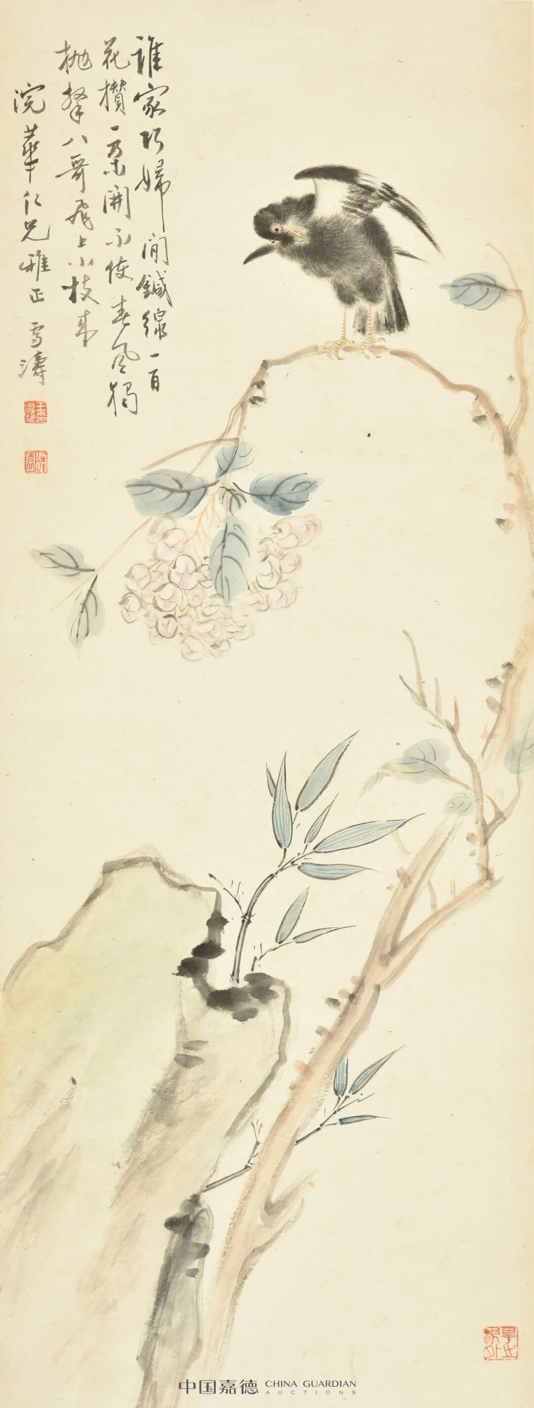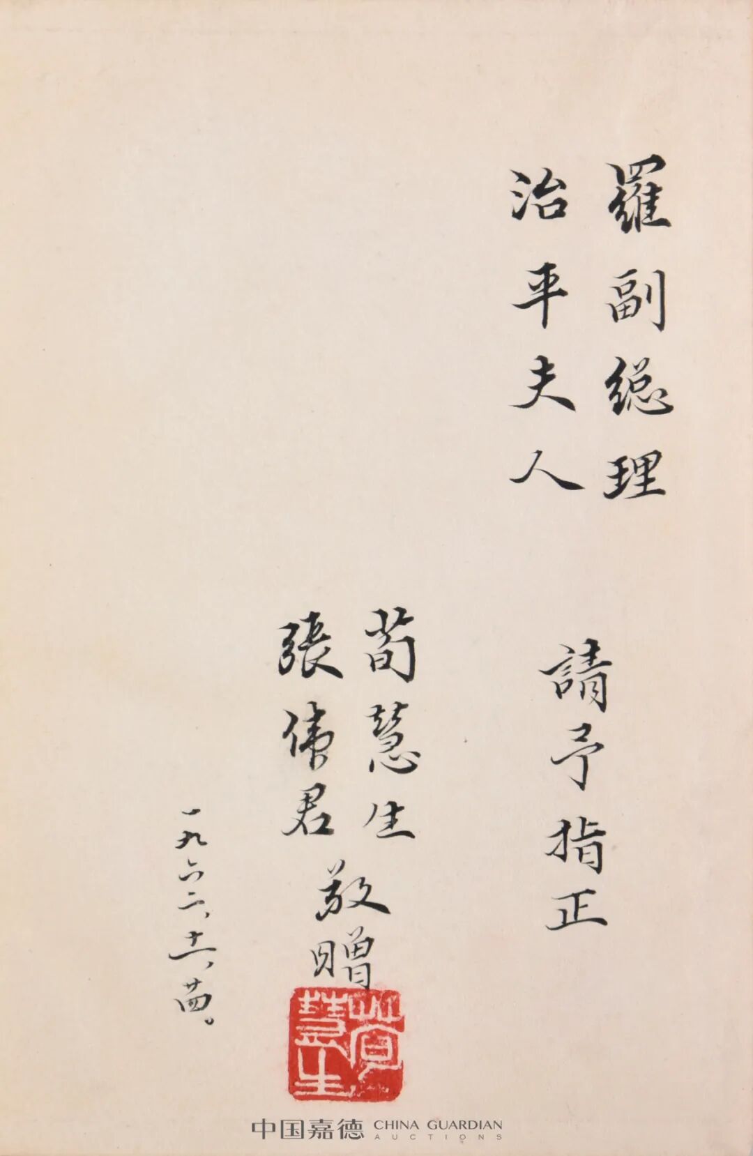 王雪涛(1903-1982),原名庭钧,字晓封,号迟园,河北成安人。中国现代著名小写意花鸟画家,先后受教于陈师曾、王梦白、齐白石等任,历任北京画院院长、中国美术家协会理事、美协北京分会副主席等职。此件为王雪涛题赠梅兰芳之作,藏家直接得自梅兰芳后人。