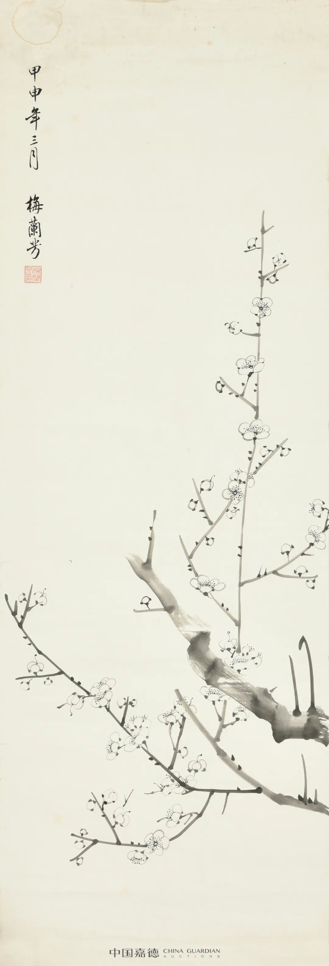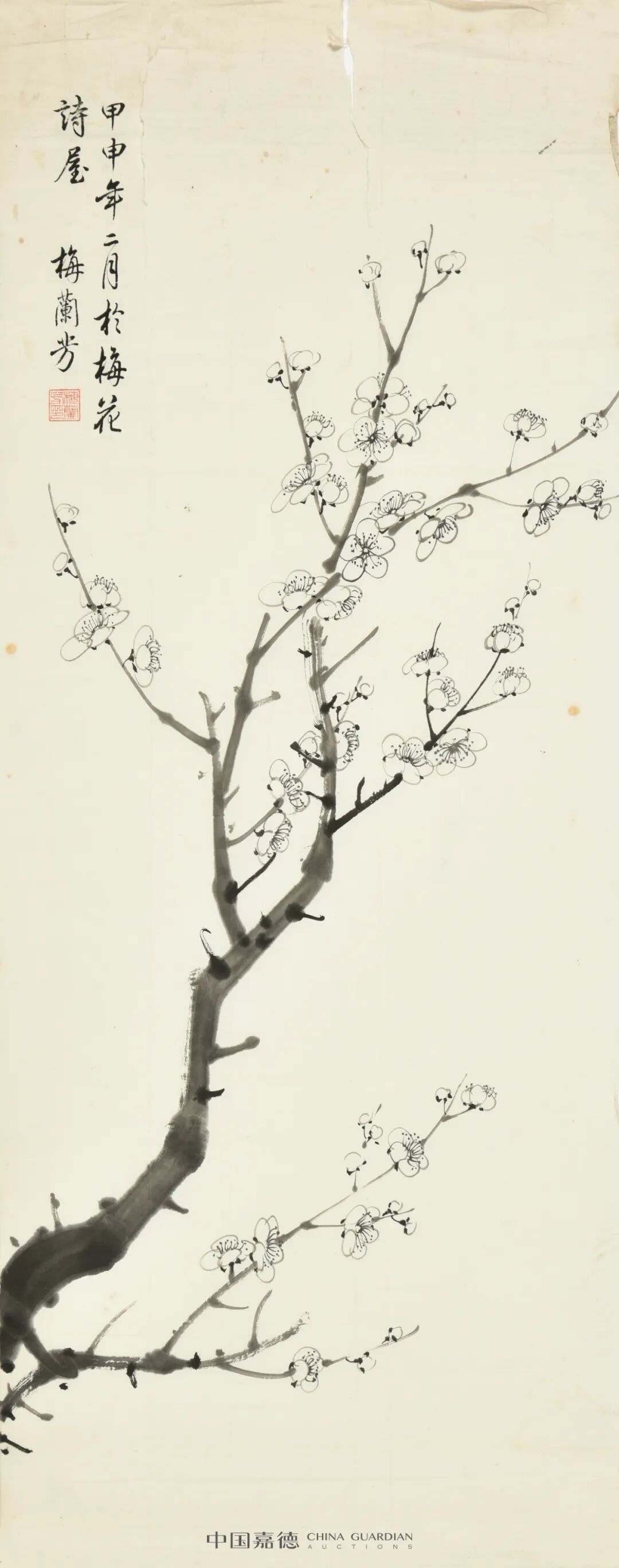 1944年端午节,汤定之、吴湖帆、叶恭绰等人聚集梅宅,提议举办梅兰芳画展。之后数月,梅兰芳积极作画,次年与叶恭绰在上海福州路都城饭店合办画展,展出了梅氏作品一百七十多幅,画作供不应求。本场所见两幅梅花当为那一时期集中绘制的作品,藏家直接得自梅兰芳后人。