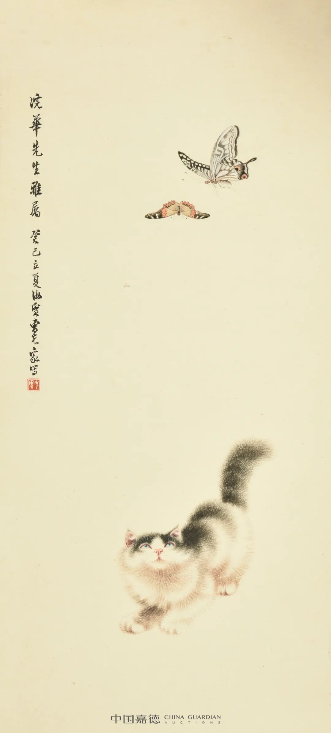 曹克家( 1906-1979),别名汝贤,北京人。师从陈师曾、王梦白、齐白石、陈半丁诸氏,翎笔花卉,尽得师传。尤擅画猫,所作栩栩如生,神态逼真。曾任中央工艺美术学院教师,轻工业部工艺美术公司干部,为中国美术家协会会员。此件为曹克家题赠梅兰芳之作,藏家直接得自梅兰芳后人。