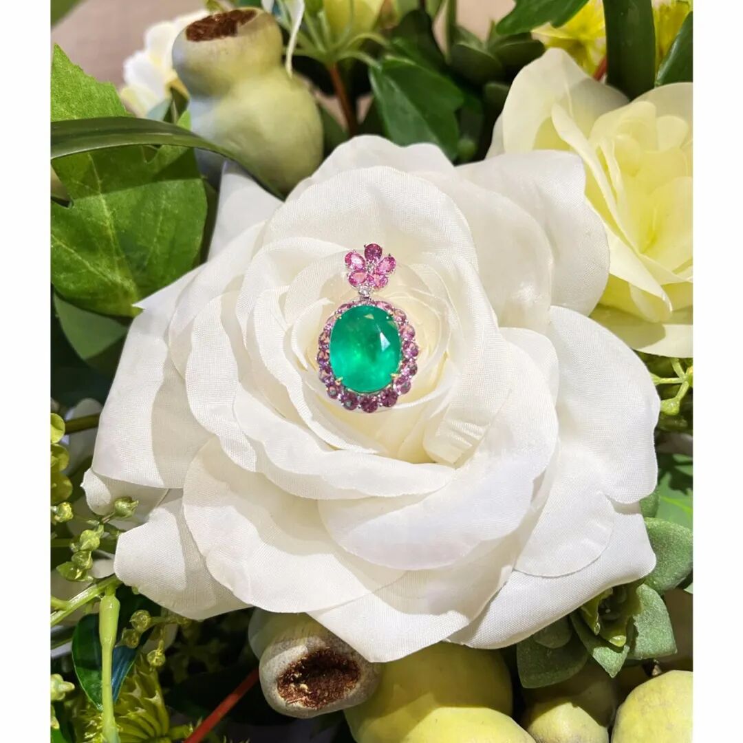 8.37克拉哥伦比亚祖母绿配18K白金粉蓝宝及钻石吊坠(微油)