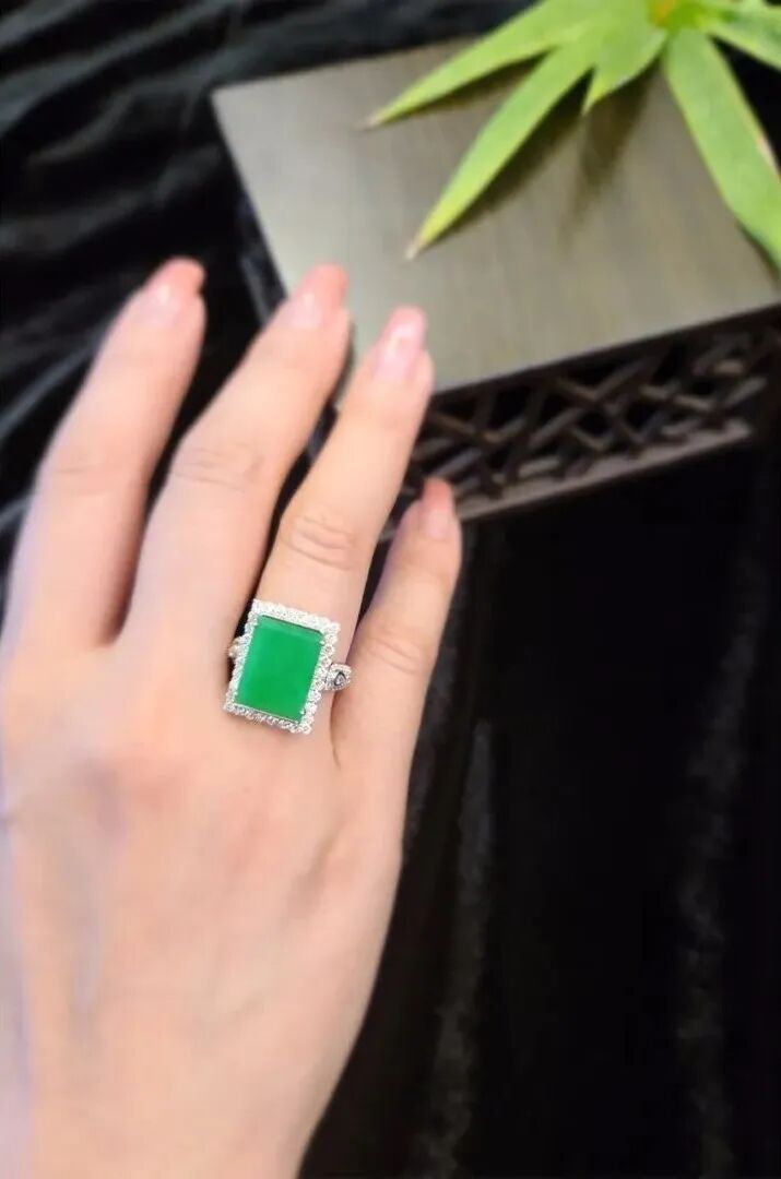 缅甸天然满绿翡翠配18K白金钻石蛋面戒指
