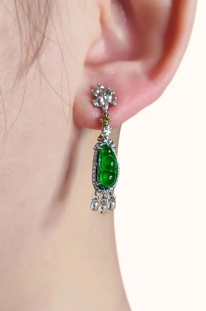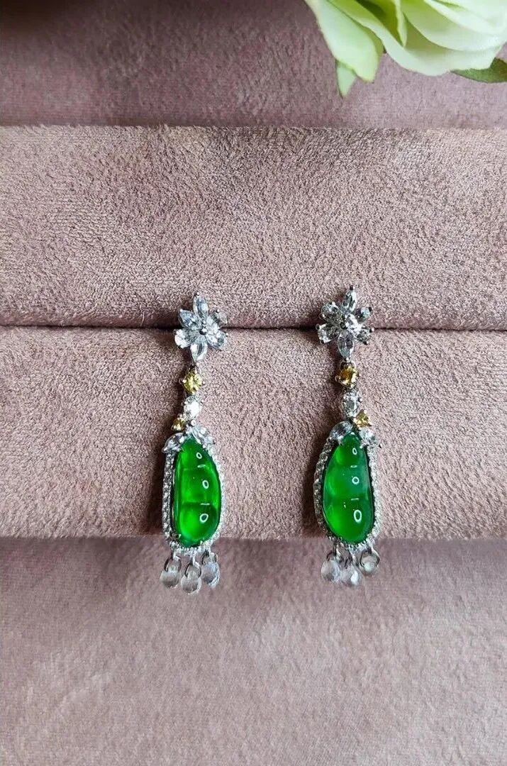 缅甸天然满绿翡翠配18K白金钻石福豆耳环一对