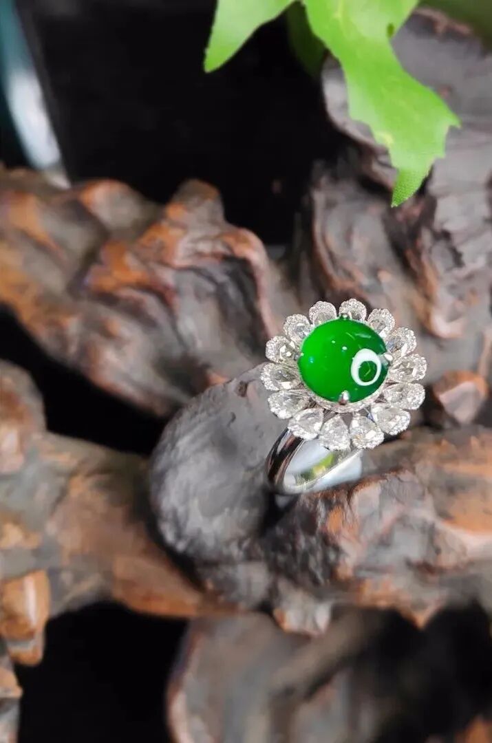缅甸天然满绿翡翠配18K白金钻石蛋面花形戒指