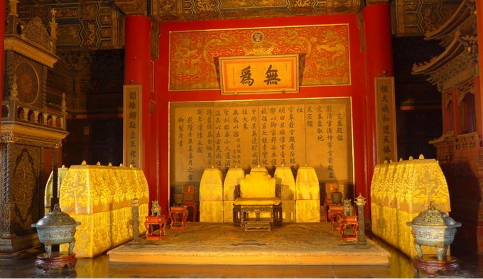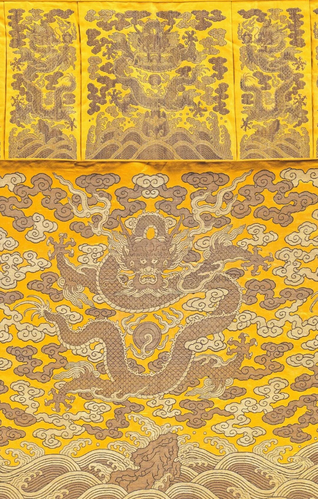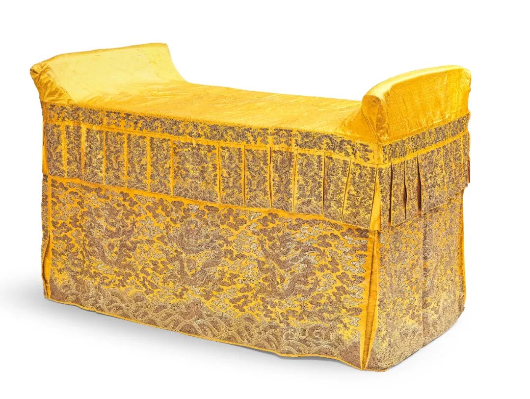 形如本例可覆盖翘头供案桌面及全部四周之桌套,殊为少见。北京故宫交泰殿内存有乾隆皇帝指定、象征皇权至高无上之二十五方御用宝玺,一宝一盝;木质宝盝皆置于木几上,外罩绣龙纹的黄缎罩,分列于御座之后及两侧。这些用于覆盖宝盝和几座的缎罩同样以金银龙纹装饰织就,纹饰风格极似本例,富丽堂皇。![]()
