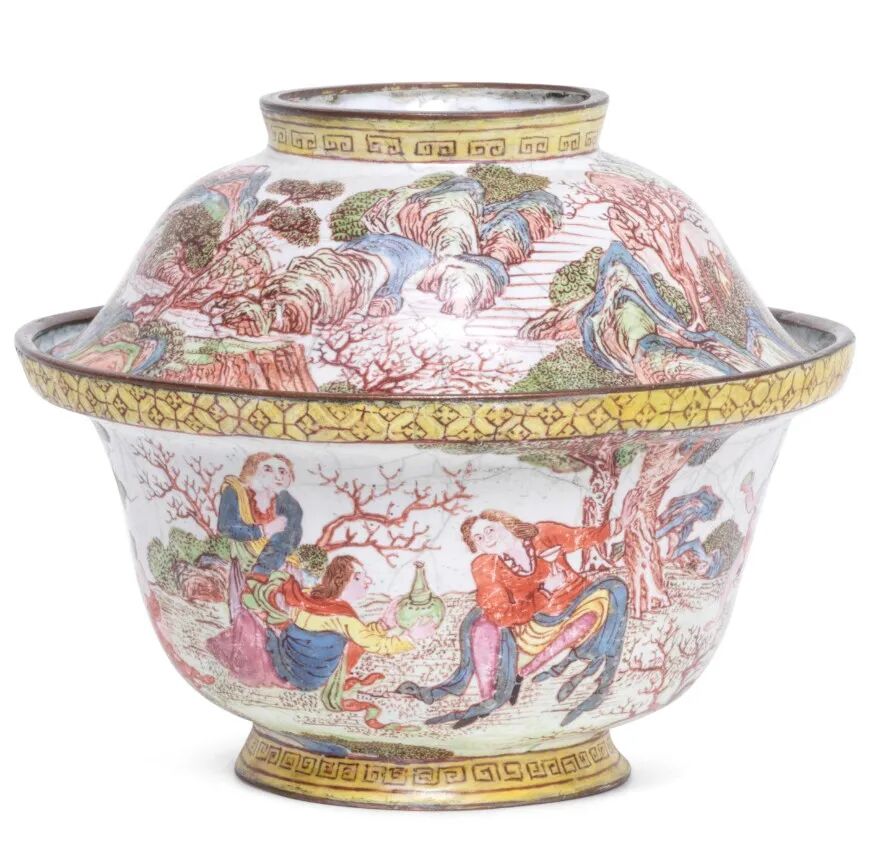 其他精采拍品包括:19 世纪粉彩“无双谱人物纹” 夔龙耳大瓶一对(拍品编号 152)、19 世纪精美纸本水粉外销人物画一组七幅(拍品编号 423),描绘节庆与日常生活;一对十八世纪铜胎掐丝珐琅“大吉”葫芦瓶(拍品编号 527),这对葫芦瓶饰有大量的藤蔓和卷须,是子嗣绵延无尽、子孙万代的吉祥象征;和一枚19 世纪精致的点翠嵌珠宝龙凤纹头饰(拍品编号 500)。这种使用翠鸟羽毛镶嵌于贵金属底座的加工技艺被称为“点翠”,被认为是皇后、妃子以及明清两代的高阶官员的妻子最华丽的装饰形式之一。