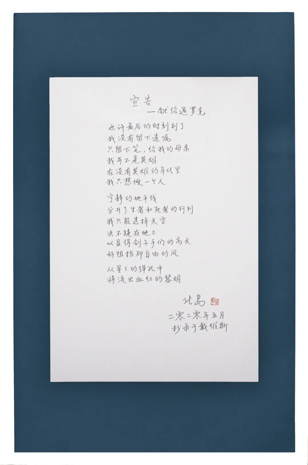 然而,所有的大艺术家又必将超越青春的激荡,去探索更加永恒的时间命题。我们发现,在北岛新近出版的作品集中,没有收录《回答》一诗。其实,那也是一种对于青春的态度,一种有意的遗忘与记忆。