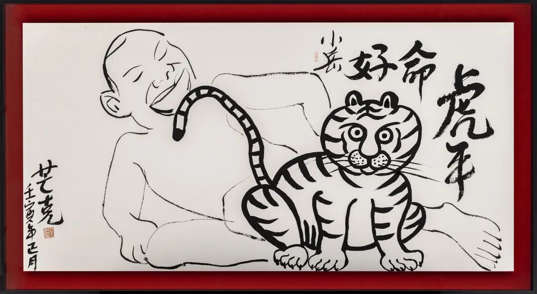 如今的芒爷依旧率真爽朗,广结好友。今年正月,他与岳敏君合作完成了一组水墨作品《好命虎年》和《两只老虎》。