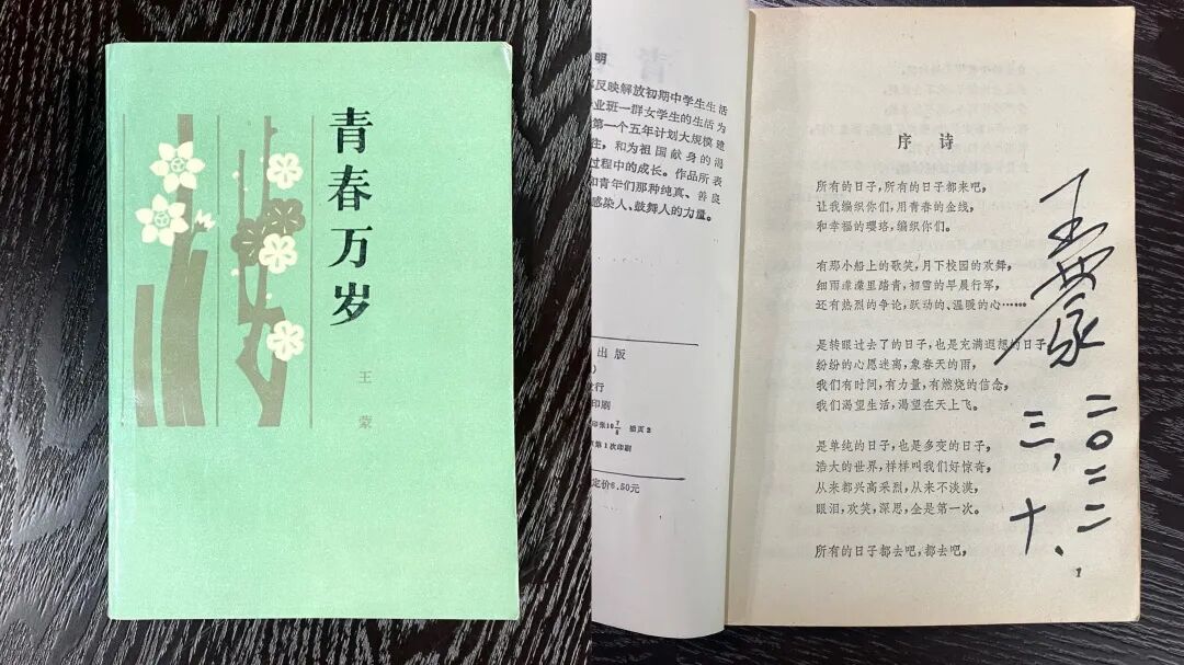 说明:海报为电影《青春万岁》1983年版海报,由王蒙2022年补题。附作者签名版《青春万岁小说》