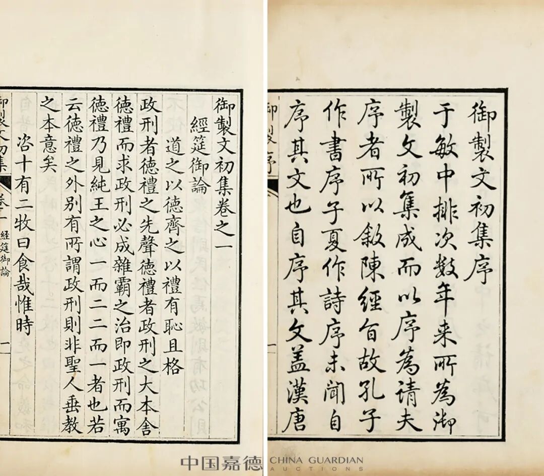 清乾隆二十八年(1763)内府刻本《御制文初集》为清高宗所刊首部文集,内收乾隆元年至二十八年(1736-1763)高宗弘历所作各体文章500余篇,天文、地理、政事、艺术无所不包,系研究清中期历史及乾隆帝本人思想的重要史料。卷首乾隆甲申年(1764)《御制文初集序》,次蒋溥、刘统勋等跋,次沈德潜跋,次乾隆二十八年(1763)于敏中表,次上表,次目录。惜卷十七、十八为抄补。