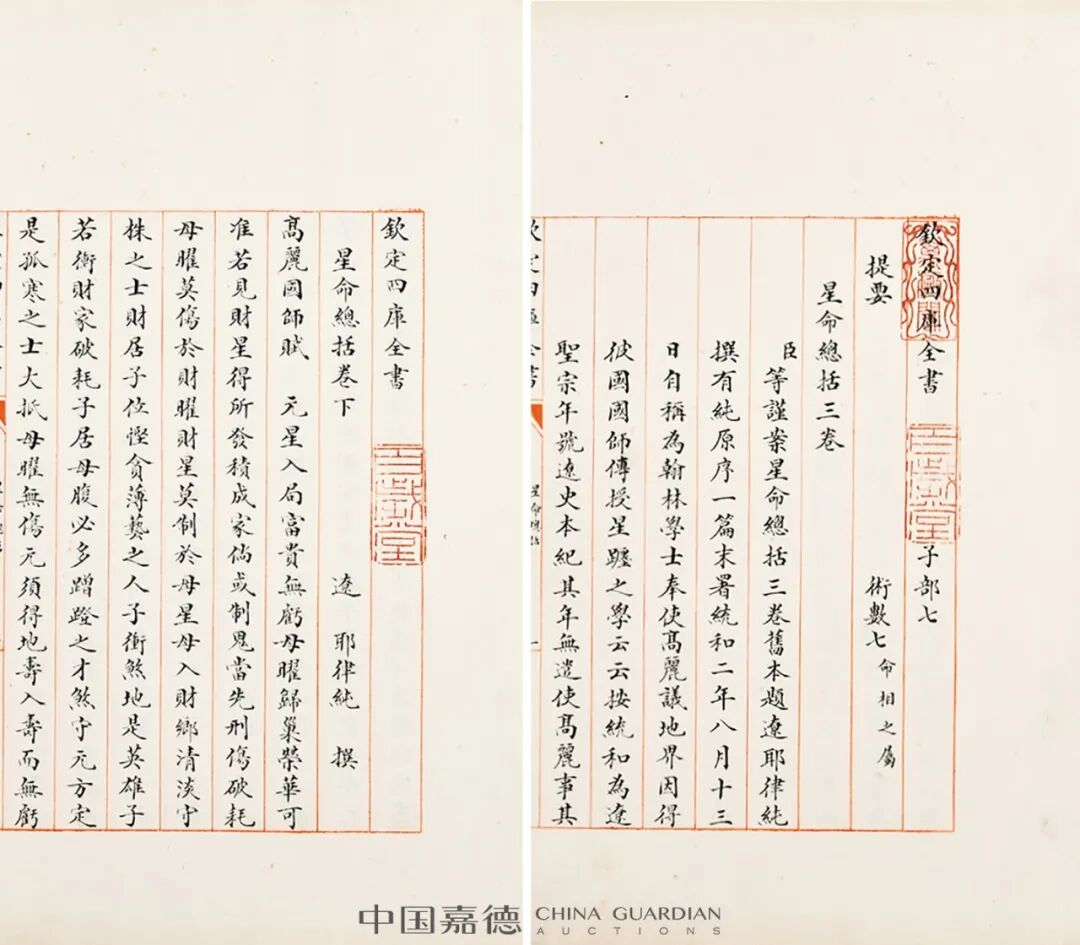 《四库全书》为清代内府抄本极则,易庐所藏《星命总括》系据《四库全书》红格精抄本,版心上墨书“钦定四库全书”,版心间记“星命总括”、卷数及页数。卷首书“钦定四库全书。子部七。提要。术数七。命象之属。星命总括三卷”,次提要、次原序。签题“据四库抄本星命总括”。点划劲雅,抄写工致。原书有易庐书号218,未见著录于《易庐易学书目》,可补卢氏藏书著录之阙。