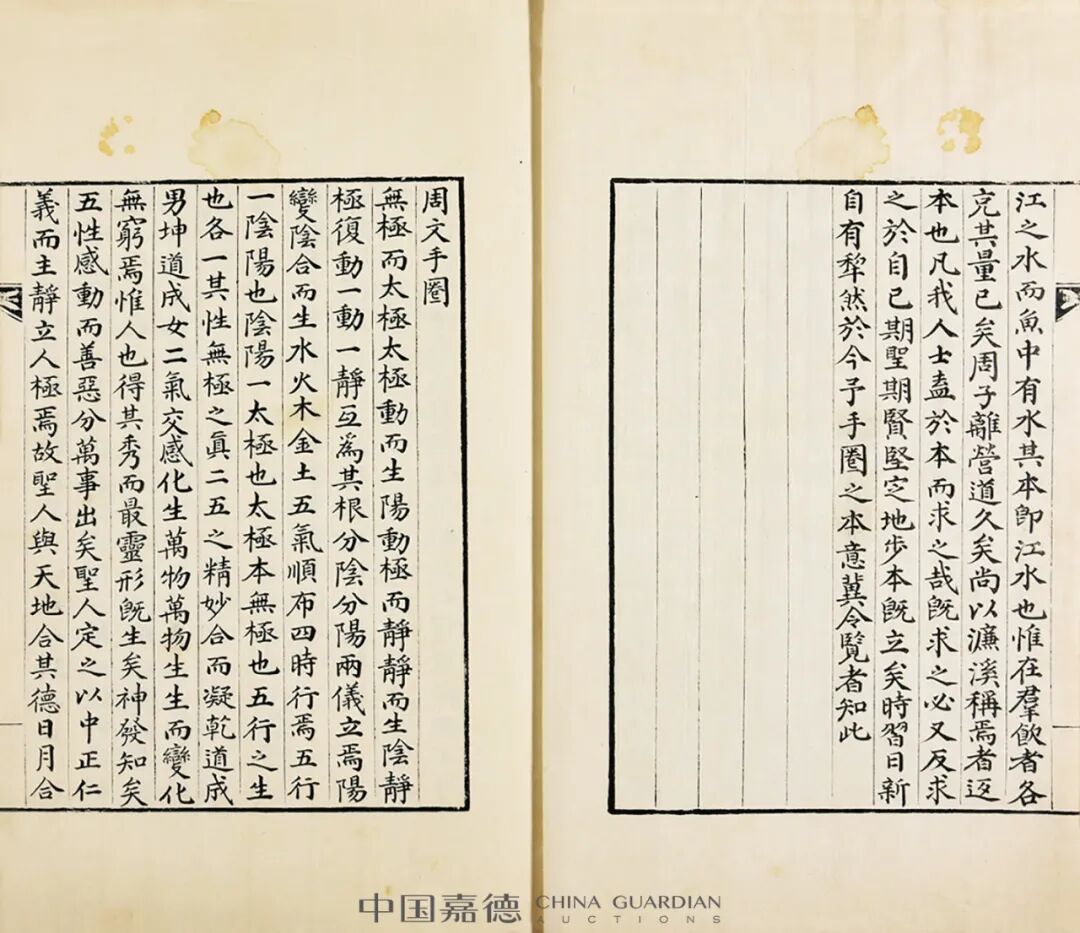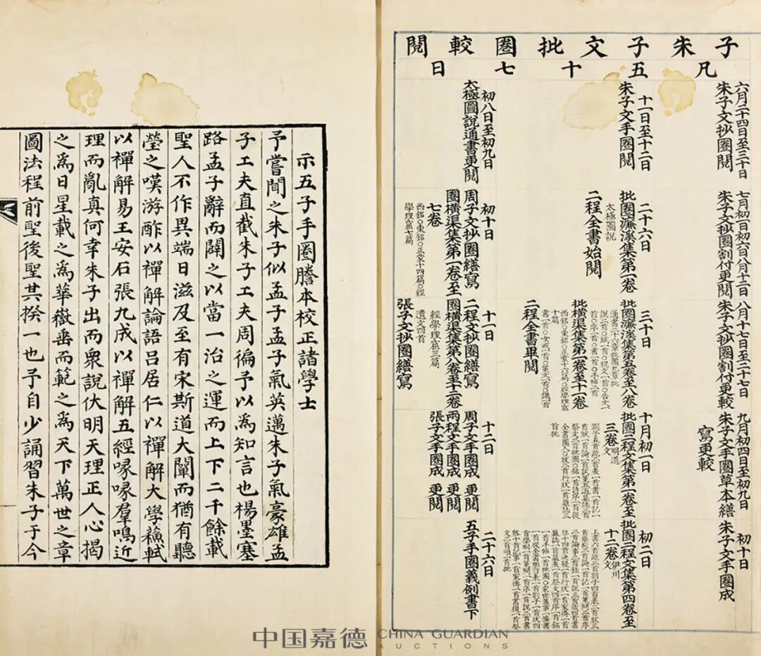近代朝鲜抄本《五子手圈》,开本极为阔大,颇有明代内府经厂本遗风,全书墨书“天启四年春正月黄应恩抄于藏书阁”。是书卷首《戊午课程日表》,次《示五子手圈誊本校正诸学士》,内收《周文手圈》、《张文手圈》、《朱文手圈》六卷,开本阔大,抄写工致。