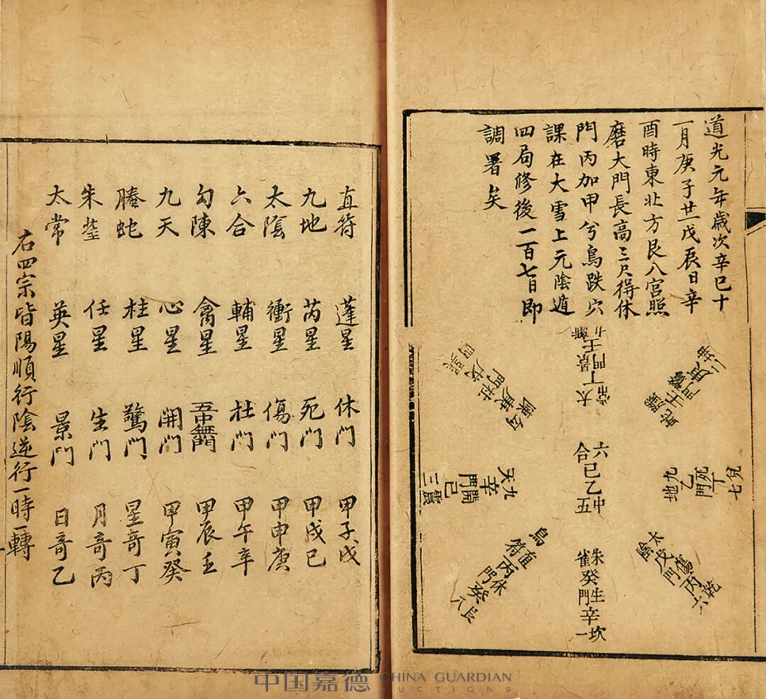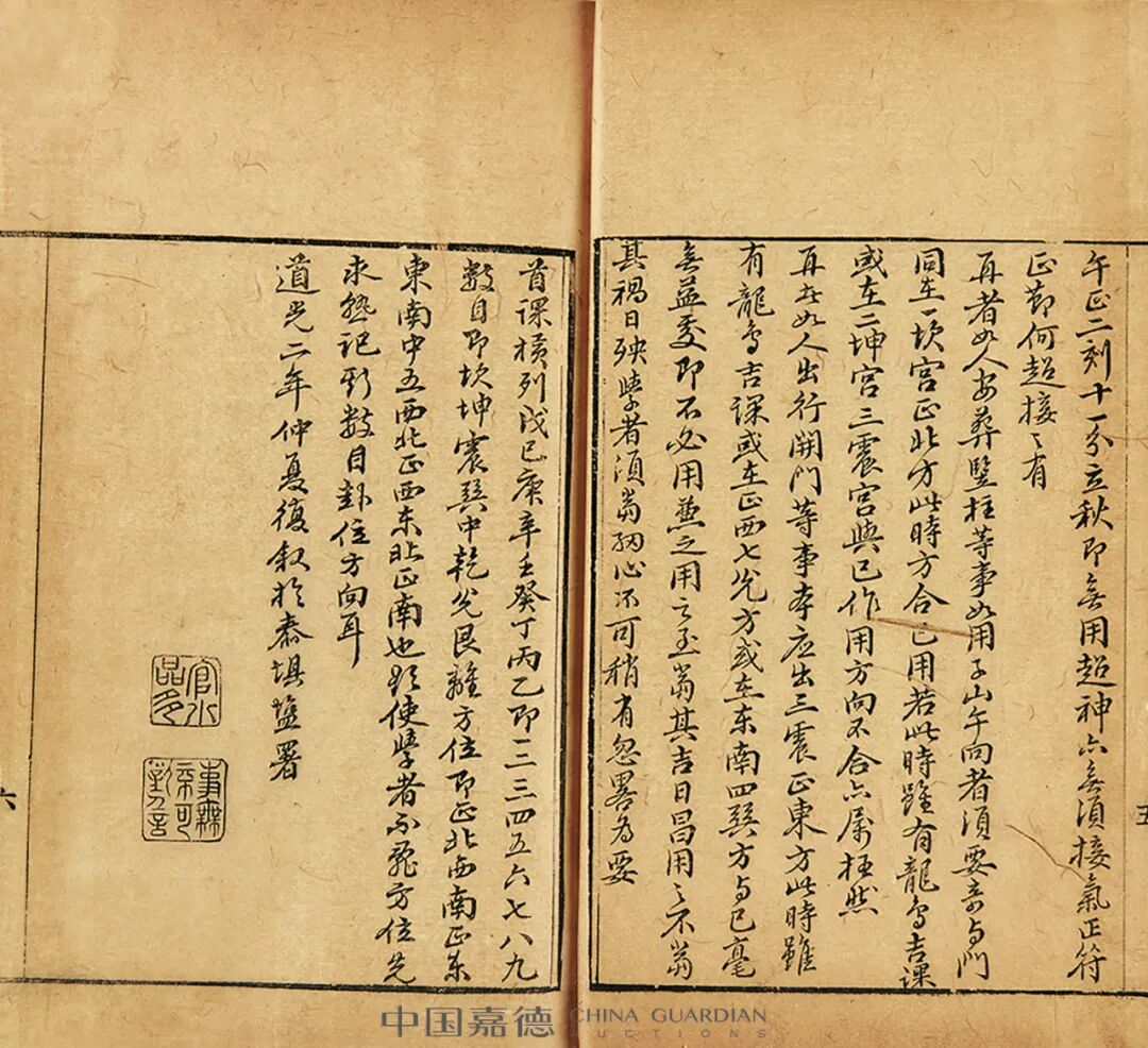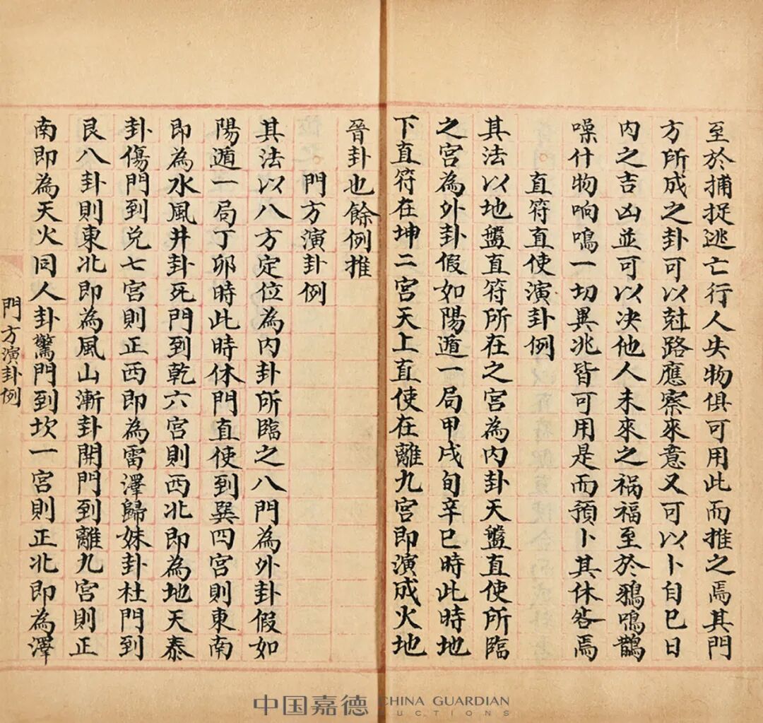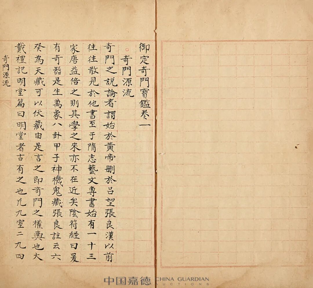 此次嘉德古籍部征集所得卢松安先生旧藏善本二十种,以《周易》类抄本、命理图书、明版古籍为主,特别以易庐藏书中最有代表性的抄本领军。《周易》类抄本秘笈为卢松安易庐藏书一大特色,其主体绝大部分已收藏于山东省图书馆,外人无缘得见。可见,仍有部分精品为先生所自藏,清抄本《御定奇门宝鑑》即为其中之一,有易庐藏书号210。《御定奇门宝鑑》为子部术数类,奇门遁甲类中论述奇门专书。