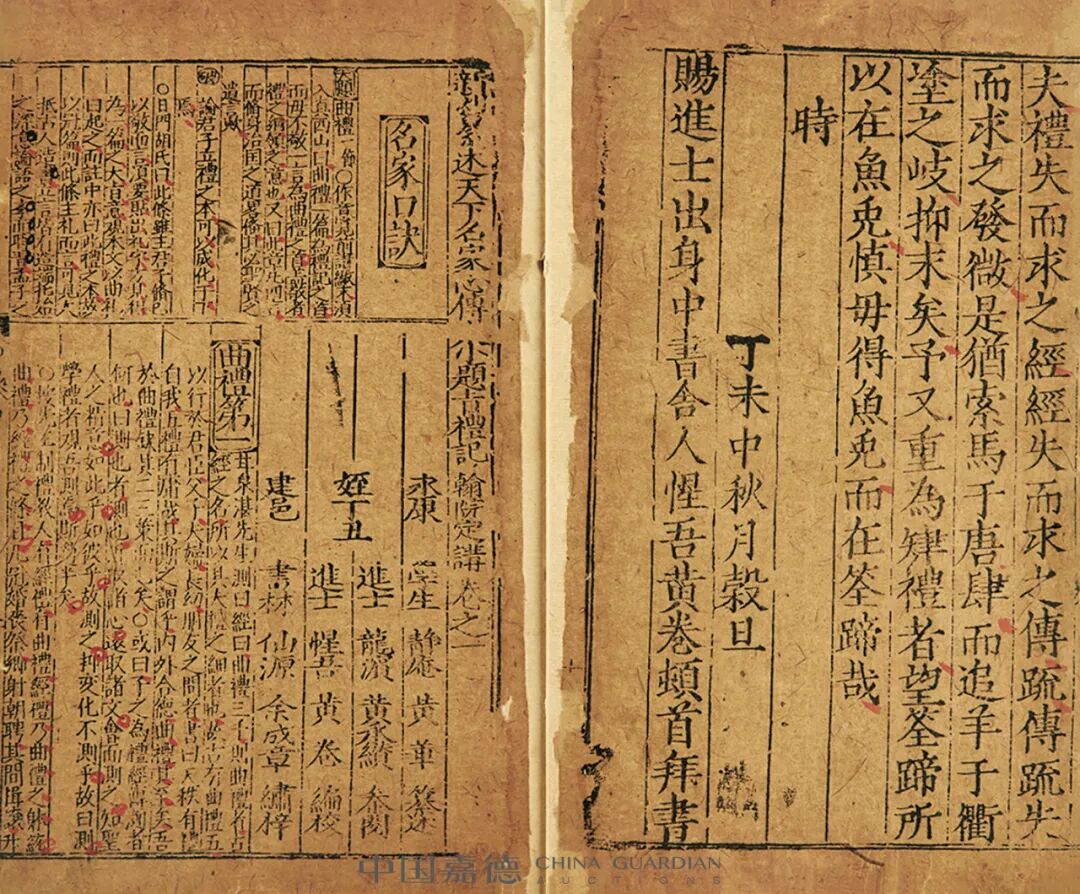 除去命理图书之外,明版古籍也为先生藏书之旨趣,此次所得《新刻纂述天下名家心传大小题旨礼记》,共二十二卷,为明万历间进士黄卷(字惺吾)纂辑。卷首丁未年黄卷《刻礼记翰林院定□序》,卷一标题行镌“新刻纂述天下名家心传大小题旨礼记翰林院定讲卷之一”,次行镌“永康学生静安黄华纂述/姪丁丑进士龙滨黄承赞参阅/进士惺吾黄卷编校/建邑书林仙源余成章绣梓”。汪镛旧藏。