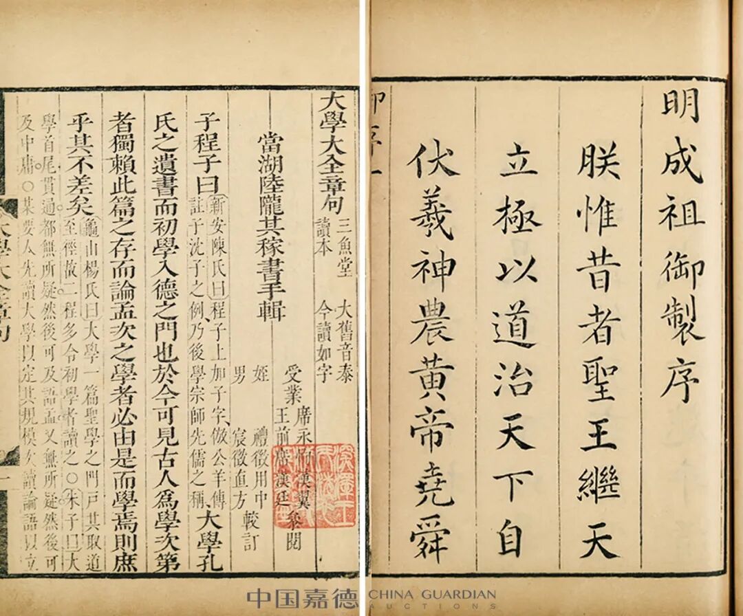 《四书大全》为明永乐十二年(1414年)胡广等奉敕编纂图书,明成祖为之序,颁行天下,成为官定经学教科书。对后世影响甚大。此次所得为清康熙间宝翰楼刻本,内封镌“平湖陆稼书先生点定/四书大全/附录语类蒙引用存疑浅说达说说约/嘉会堂藏版/宝翰楼梓行”,内收《大学大全章句》一卷、《大学或问》一卷、《中庸章句大全》二卷、《中庸或问》一卷、《论语集注大全》二十卷、《孟子集注大全》十四卷、《论孟考异》一卷。/span>