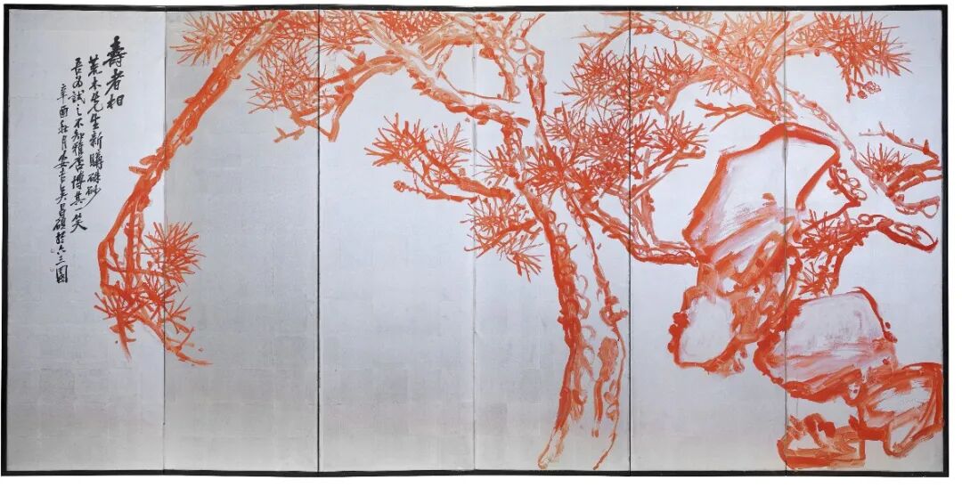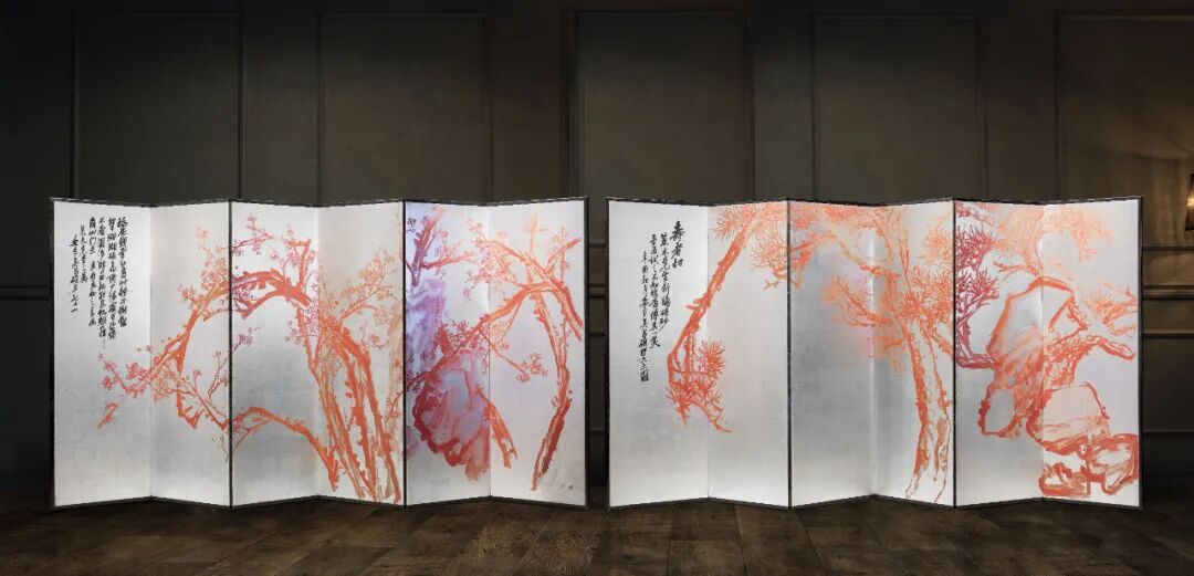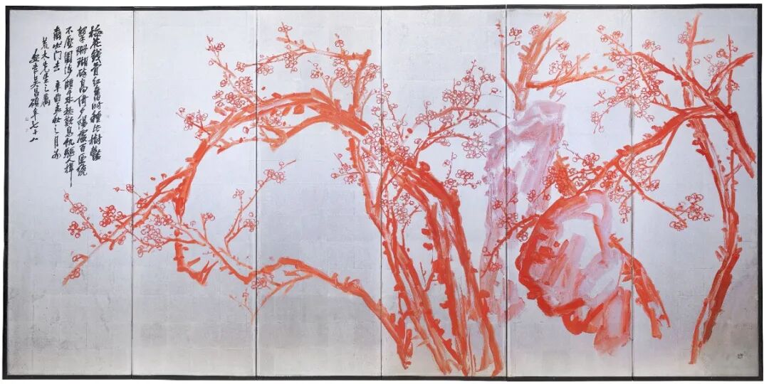曾佑和,曾名佑荷,生于北京。一九四一年入辅仁大学大学美术系,师从溥雪斋。一九四九年移居香港,后移民夏威夷,担任夏威夷大学艺术系教授等职。她于中国传统书画造诣极深,又谙熟西方表现及色彩技法,中西兼修。丈夫古斯塔夫·艾克(1896-1971)是西方研究中国明式家具的重要学者。如同大多数旧时中国女性,曾佑和自幼随祖母学缝补。上世纪四十年代中期,还曾研习装裱和修复书画。一九五〇年代起,又与丈夫游历欧美,与诸多西方艺术家交流。她将这些经验融汇沉淀在创作中,于是有了“缀画”,即将宣纸层叠拼贴,并与颜料、铝箔等材质融合于画面中,形成独特的效果。本幅《山流如河》,为四联屏通景,此种形式借鉴于传统的中国山水画。曾佑和自如地运用”缀”法,将手工制作的宣纸叠拼于帆布上,色、墨在层叠中若隐若现,群山几乎化为无形,仅塑造出局部的山形,一道白练,状如河流、如行云,青山幽林亦随之起伏,静谧、安宁,又呈现出山水之气势磅礴。中日两国一衣带水,艺术交流自古延绵不绝,二十世纪以来益发频繁。白石、缶翁于东瀛艺坛如日中天,追捧者如过江之鲫。这对屏风,取”岁寒三友”之松树、梅花,以朱砂绘于六曲银笺屏风上,乃缶翁晚岁之鸿篇巨制,写赠荒木先生,虽曰沧海一粟,亦令人得窥中日艺坛互动的一鳞半爪。吴昌硕