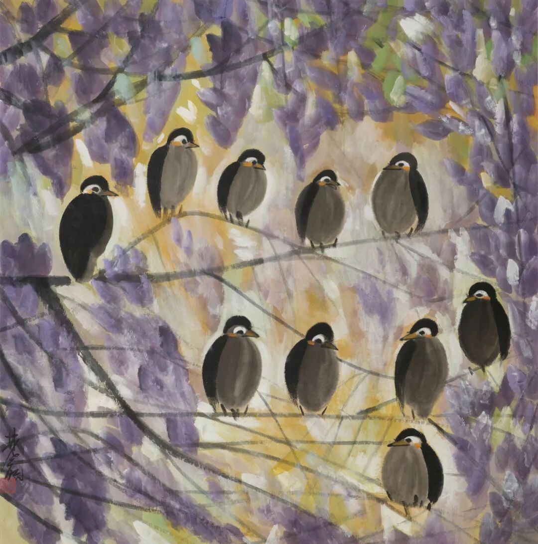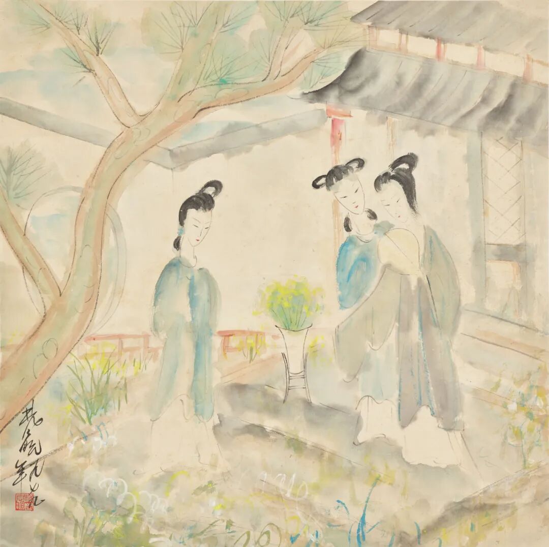 经历了生命的惊涛骇浪,晚年的林风眠开始追摹从前的画题,为创作注入新的激情。学生吴冠中激赏此时期的创作,不仅笔墨苍老,色彩更加斑斓。本幅《游园》款署“一九七九年”,对照其五、六十年代所作《游园》,保留了惯用的构图,人物居中,庭院回廊在后,左侧树木躯干,占据一角;而颜色更为轻松明快,艳丽的黄、娇嫩的绿及澄澈的蓝相组合,乃风眠笔下不多见的温馨,观之令人赏心悦目。林风眠