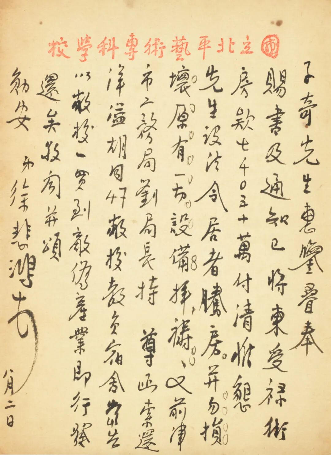张子奇(1894-?),山西五台人。毕业于山西陆军小学第四期,参加辛亥革命,又赴日本留学,归国后追随阎锡山、冯玉祥,复加入国民党军统组织。抗战期间,任天津电话局局长、国民政府财政部视察室主任,曾协助张自忠的抗日活动。胜利后,军统局设立河北平津区敌伪财产清查委员会天津分会,时为军统局设计委员的张子奇兼任天津分会主委,负责清查民间隐匿的日伪产业清查工作,曾协助王世襄从日本人手中为国家追讨回一批文物。一九四六年,又任天津市副市长,后赴台。据信札内容推断,此信应写于一九四六年八月二日,甫任北平国立艺专校长的徐悲鸿托请张子奇解决两处曾被日伪占据的房屋问题。东受禄街房产位于16号,为徐悲鸿旧居,一九五四年曾辟为徐悲鸿纪念馆。洋溢胡同47号系北平艺专教员宿舍,艾中信、冯法祀、董希文等艺术家均曾于此居住。简短百余字,涉及众多历史事件,艺术与文献价值兼备。陈半丁