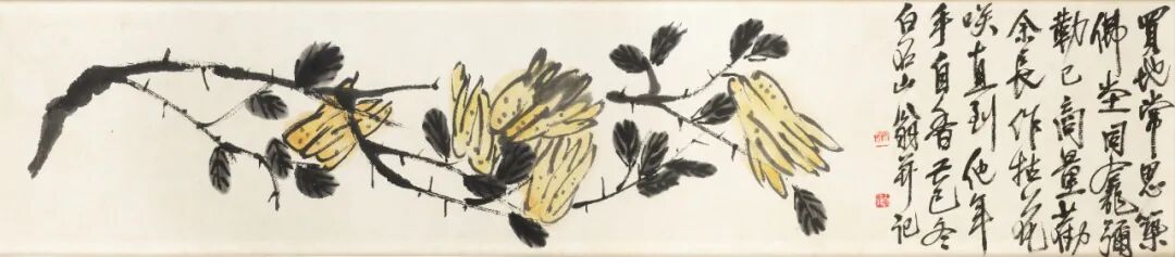 齐白石作佛手不多,但贯穿衰年变法至晚岁,偶一出手,喜题此诗,或许是画家在境况困窘时的自我安慰与勉励,颇具禅意,彰显性情。他曾自称“半个和尚”、“与佛有缘”。民国初年,为避家乡兵乱,北上京城,“从法源寺搬到龙泉寺,又从龙泉寺搬到石镜庵,连搬三处,都是住的庙产。”齐白石常画佛像,亦与诸多方外人士往来,甚至考虑百年之后,埋骨于陶然亭慈悲禅林。然而,如同他题画自况句:“修来清静华严佛,尚有尘寰未了因。”虽有佛心,但更入世。他笔下的世界五彩斑斓,充满俗世的快乐,正如本幅禅味十足的佛手。王雪涛