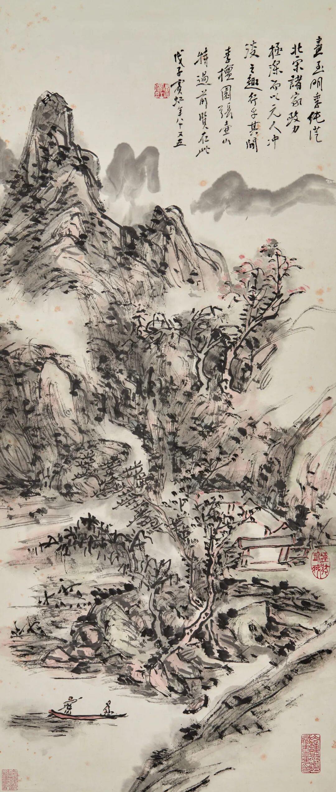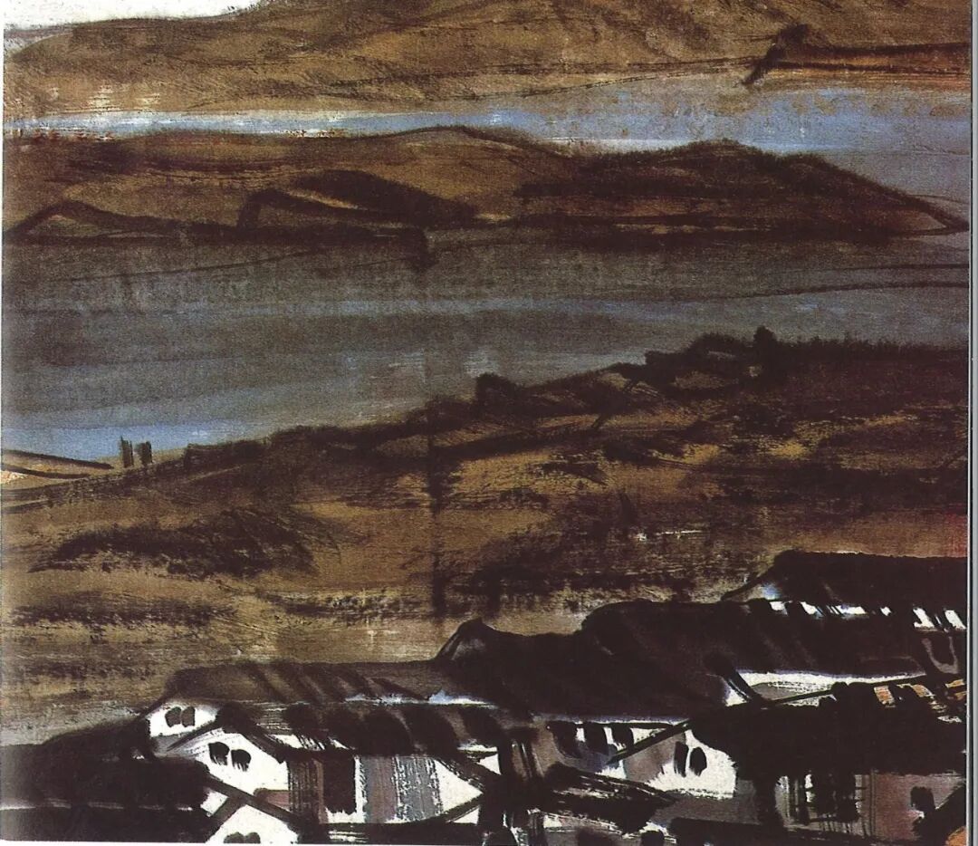 公私收藏中,林风眠作于相若时期的风景创作,已然零星。中央美术学院所藏之《村落》,创作主题及风格,皆可与本幅《嘉陵江畔》对照,应同属该时期。画面中,艺术家以秃锋硬毫,取重墨勾出山峦、房舍之轮廓,笔迹决断如刀,迅捷而有节律。水面、天空着花青渲染,山体、船屋用赭石。作品以西式焦点构图,却富有传统写意的笔墨意味,淌露着艺术家面对不同自然景象的情绪和观感,赵氏所言“生命与热情”,诚然。