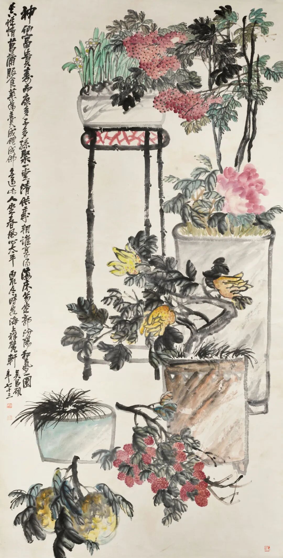 上款”荒木”应为荒木十亩(1872-1944),日本画家,生于长崎县,本姓朝长,名悌二郎,师事荒木宽亩并为其嗣子后改名。曾创办日本画会、正派同志会,任东京女子高等师范学校教授、帝国美术院委员。擅长花鸟画,在传统基础上创新日本画,强调灵性的优雅,具有象征主义风格。荒木与中国画坛交流颇多,陈师曾携齐白石画作赴日本展出,即受其邀请。上世纪二十年代,与吴昌硕、金城、贺良朴等南北名家于中日两地数次举办绘画联展。吴昌硕