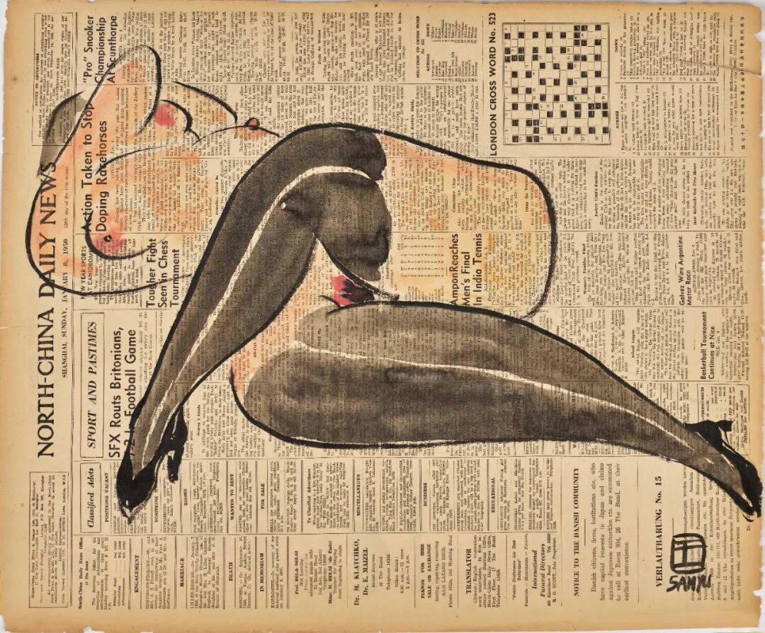 二战的炮火让常玉陷入日益困顿的境地,同许多当时的欧洲艺术家一样,常玉寄希望于到美国寻找机遇。一九四八年,常玉抵达纽约。机缘巧合中,结识了著名摄影师罗伯特·弗兰克(Robert Frank),并成为挚友。一九五〇年,在弗兰克的帮助下,常玉于纽约的帕赛杜特画廊(Passedoit Gallery)举办了一次画展,展出他从巴黎带来的作品。遗憾的是,这次展览并未售出任何画作。不久,常玉便离开纽约,回到了巴黎。可以说,这是一趟满怀希冀但不无失望的旅程。他在这两年作画极少,本幅则是此间难得的遗珠。本幅《黑丝袜裸女》绘制于一九五〇年一月八日的North China Daily News (《字林西报》),这与他的困窘相关,也侧面印证常玉性情潇洒,不拘小节,灵感及兴致所至,餐垫纸、信纸、报纸皆可作为绘画媒介。常玉作品极少署年,报纸的日期恰好界定了作品最早的创作时间,十分难得。曾佑和