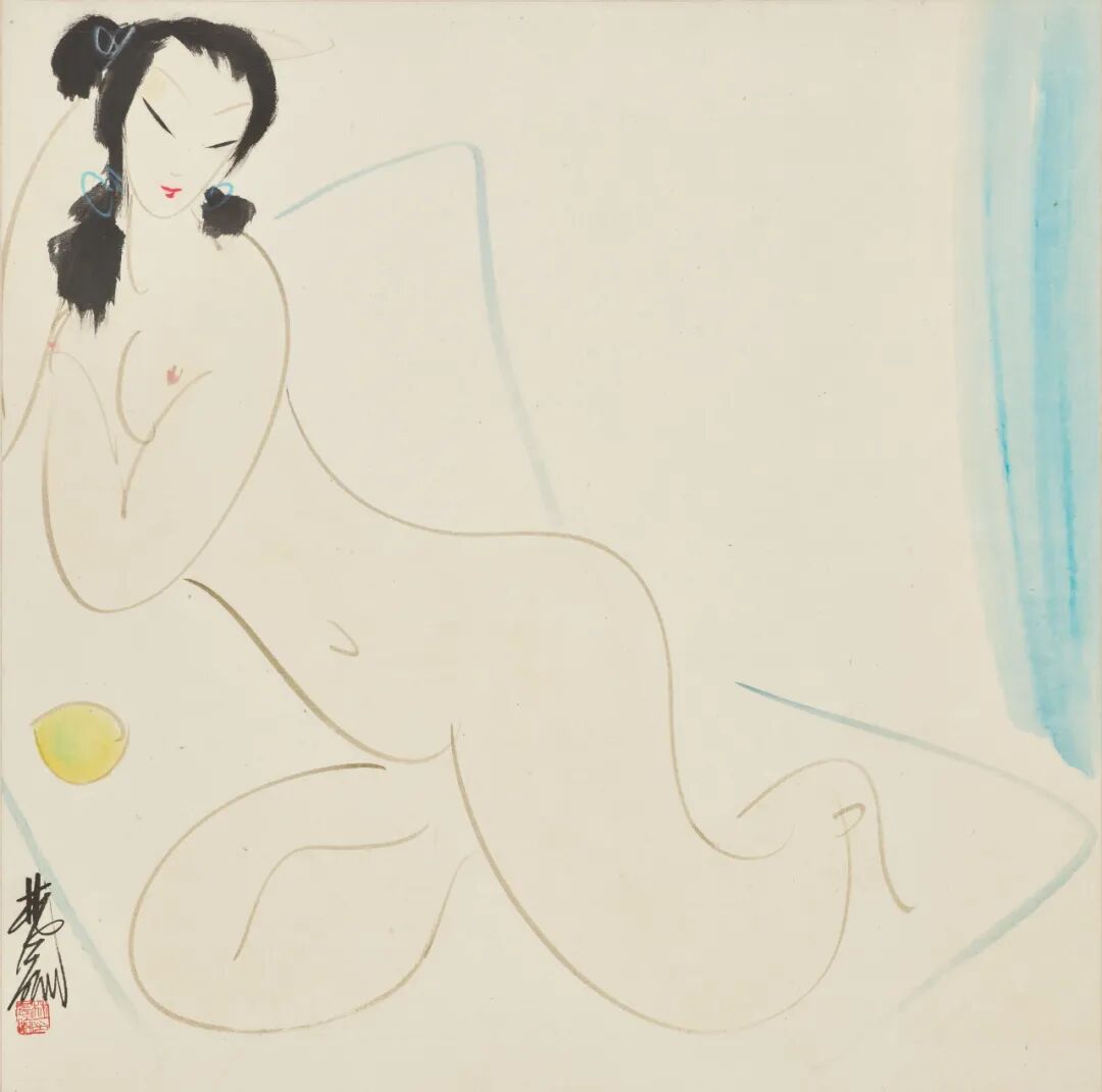 林风眠早在二十年代即以人体入画,四、五十年代探索用水墨线条刻画裸女造型,后鉴于环境而中辍。到港后,裸女再次出现其笔下,坐姿、卧姿各不相同,线条简练流畅,造型舒美匀称,颈项颀长,无疑让人联想到莫迪利阿尼笔下的女性。然细观之,细眼弯眉,樱桃小嘴,又具中国传统仕女含蓄娇羞之态。淡赭、鹅黄、湖蓝的平涂,使画面流溢着女性的柔美,令人沉醉。常玉