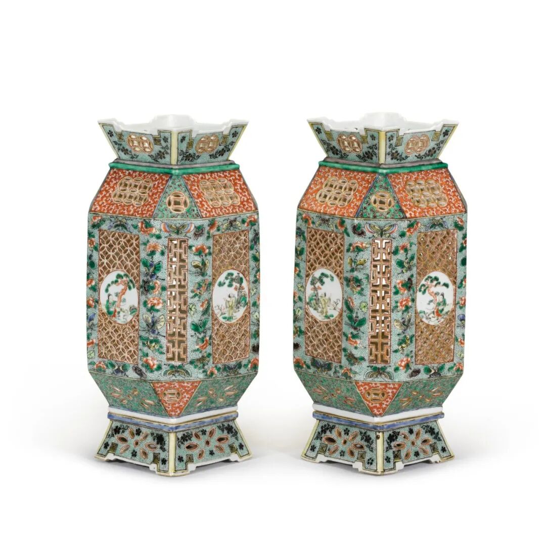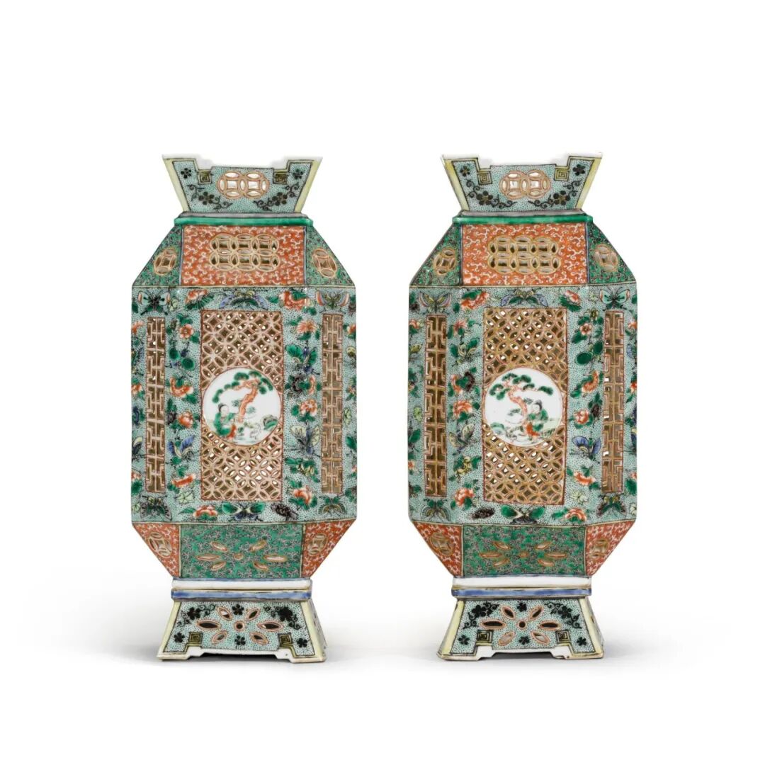 拍品估价:120,000 - 150,000 英镑1.J. F. Blacker, Chats on Oriental China, London, 1919, pl. 75.2.Fong Chow, 'Symbolism in Chinese Porcelain: The Rockefeller Bequest', The Metropolitan Museum of Art Bulletin, Vol. 21, no. 1, 1962, pg. 19, pl. III.1.小约翰.戴维森.洛克菲勒(1874至1960年)收藏2.伦敦佳士得1998年11月16日,编号232A拍品估价:500,000 - 700,000 英镑1.Nellie Ionide 女士 (1883至1962年)收藏拍品估价:220,000 - 280,000 英镑2.James Garland 收藏,编号1111(标签)3.纽约苏富比2005年10月11至12日,编号18拍品估价:180,000 - 220,000 英镑1.Charles Wrightsman 夫人收藏(1919至2019年)Lot 86 清康熙 五彩镂雕开光人物故事图灯笼一对