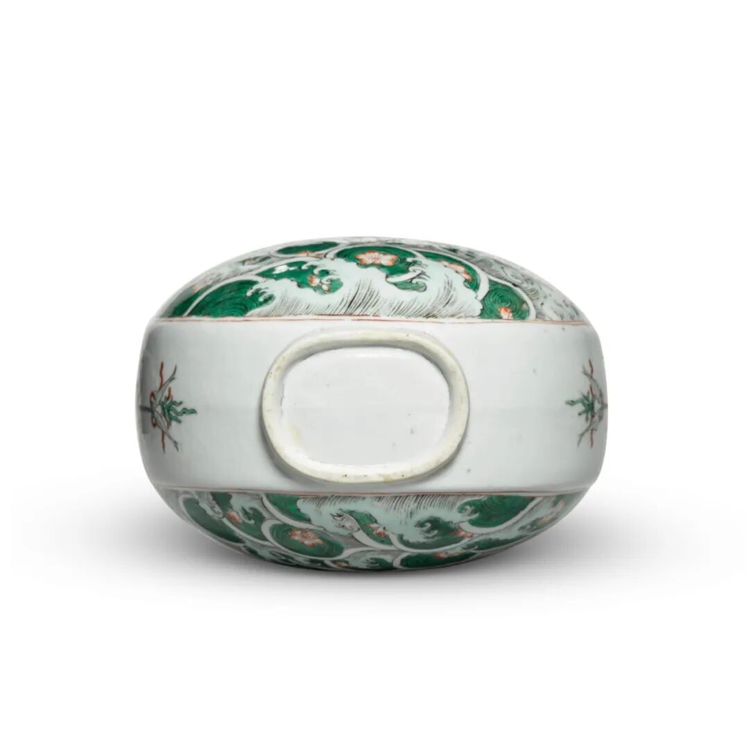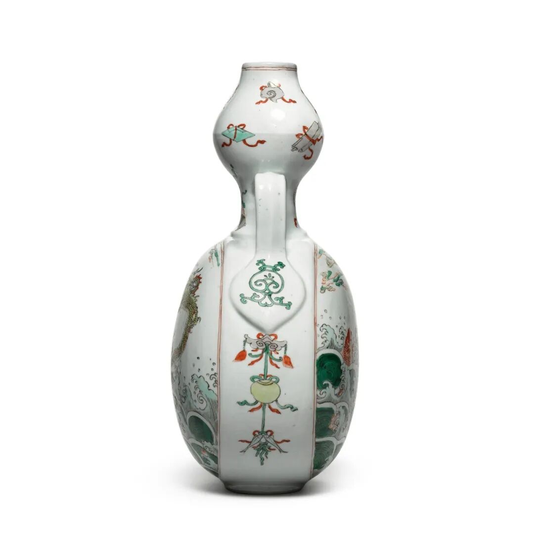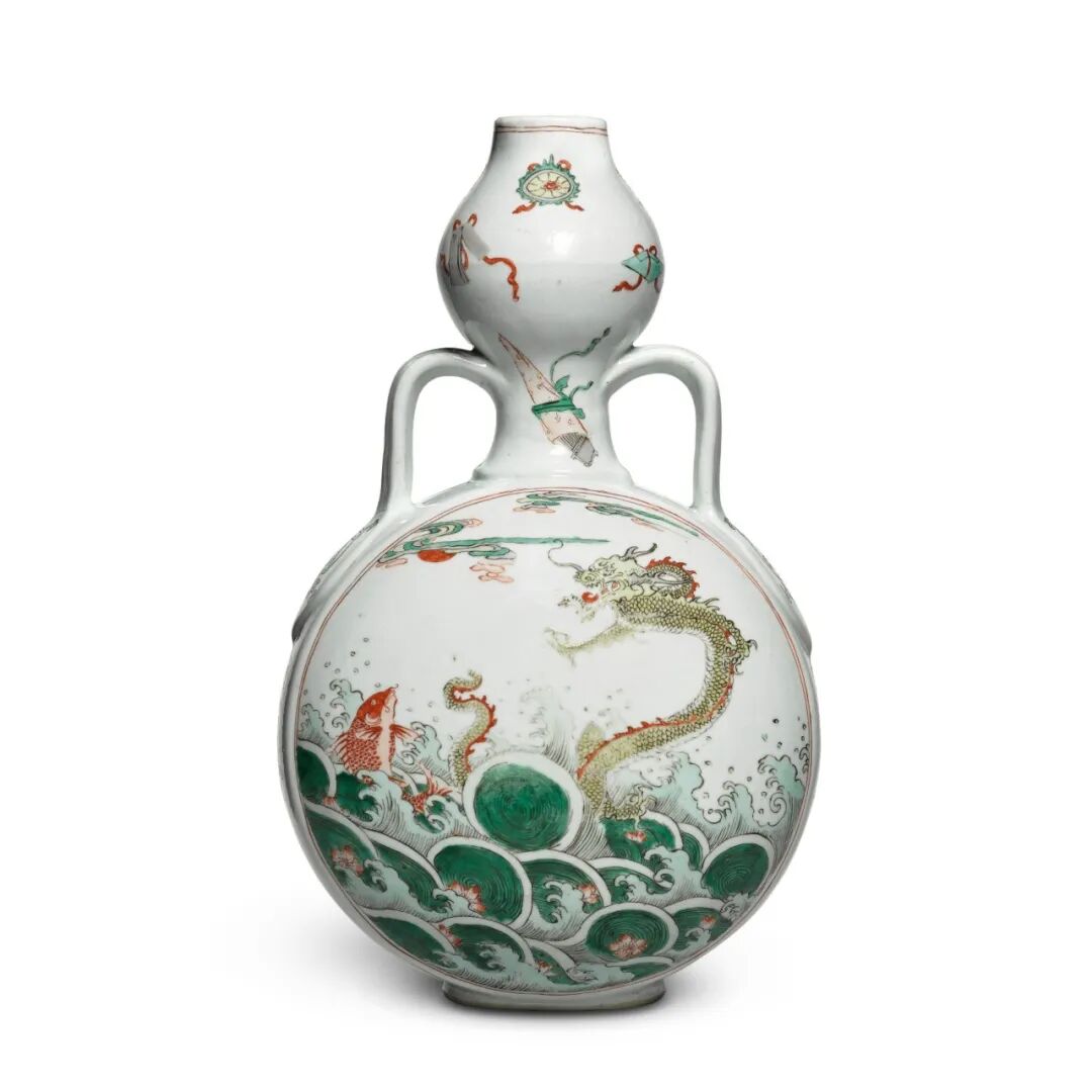 除上述德累斯顿作例之外,可见两尺寸较小扁壶,均绘彩云祥龙纹饰,亦饰龙耳,原清宫旧藏,现藏于北京故宫博物院,图载《故宫博物院藏文物珍品全集.五彩.斗彩》,香港,1999年,编号241及254。拍品估价:20,000 - 30,000 英镑