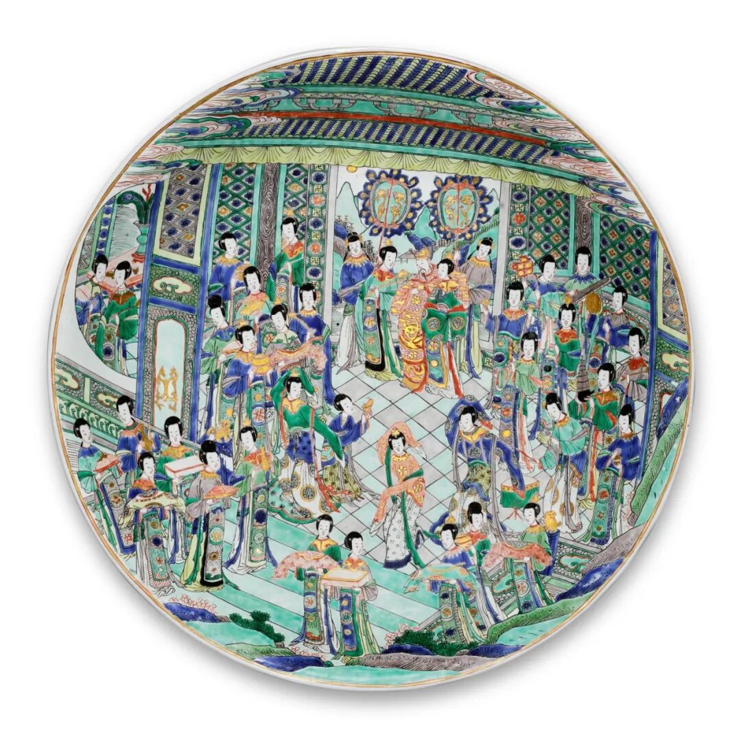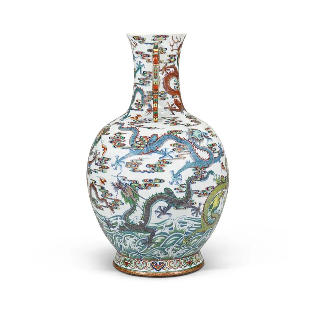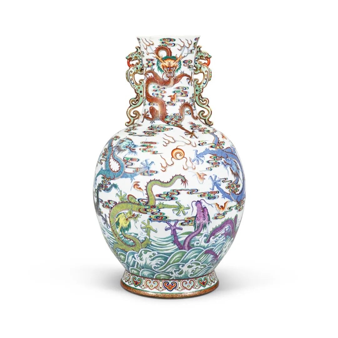 是次拍卖共计126件古董工艺品上拍,涵盖瓷器、漆器、玉器、古典家具和佛教造像等门类,John Sparks、蓝理捷、埃斯肯纳齐、洛克菲勒等名藏荟萃,从中可以了解早期海外藏家的收藏取向,同时展现了中国古代宫廷的审美意趣。本场的瓷器部分尤为吸睛,焦点包括:由苏格兰私人珍藏的一件罕见清乾隆 斗彩海水云蝠九龙纹双耳瓶,以及一组由清康熙 五彩宴舞图大盘领衔的英国著名中国陶瓷收藏家 Nellie Ionides 夫人藏珍。拍品估价:100,000 - 150,000 英镑本斗彩瓶尺寸庞大,饰九龙云海,色泽夺目,极其罕见。相近纹饰之例仅只一瓶,现存于德累斯顿国家艺术收藏馆(藏品编号 PO 5981)(图 1),其纹饰与本品对称,显示两瓶应原为一对。