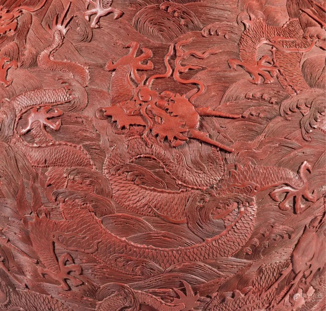 龙乃天子权力代表,而九则与久谐音,故此九龙纹饰,意寓国祚长久。相近九龙纹饰可参考数件乾隆朝作例,有青花罐、釉下青花及粉红彩梅瓶等多款,北京故宫博物院藏,图载《故宫博物院藏文物珍品全集:青花釉里红(下)》,香港,2000年,图版 118 和 230。海上红蝠纹饰,则寄愿福如东海,色彩纷呈,更添吉祥寓意。
