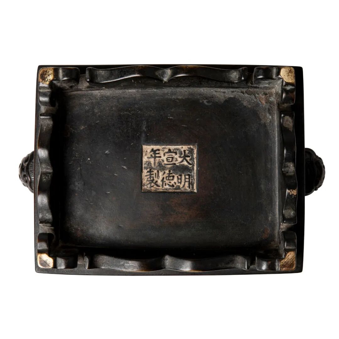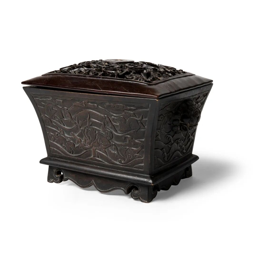 Lot 27 清 宣德款 铜铸海兽纹双狮耳长方炉 含木盖注:佳士得于2015年6月1日在香港售出纹饰与此拍品高度相似的清代长方炉,拍品717,可资比较。