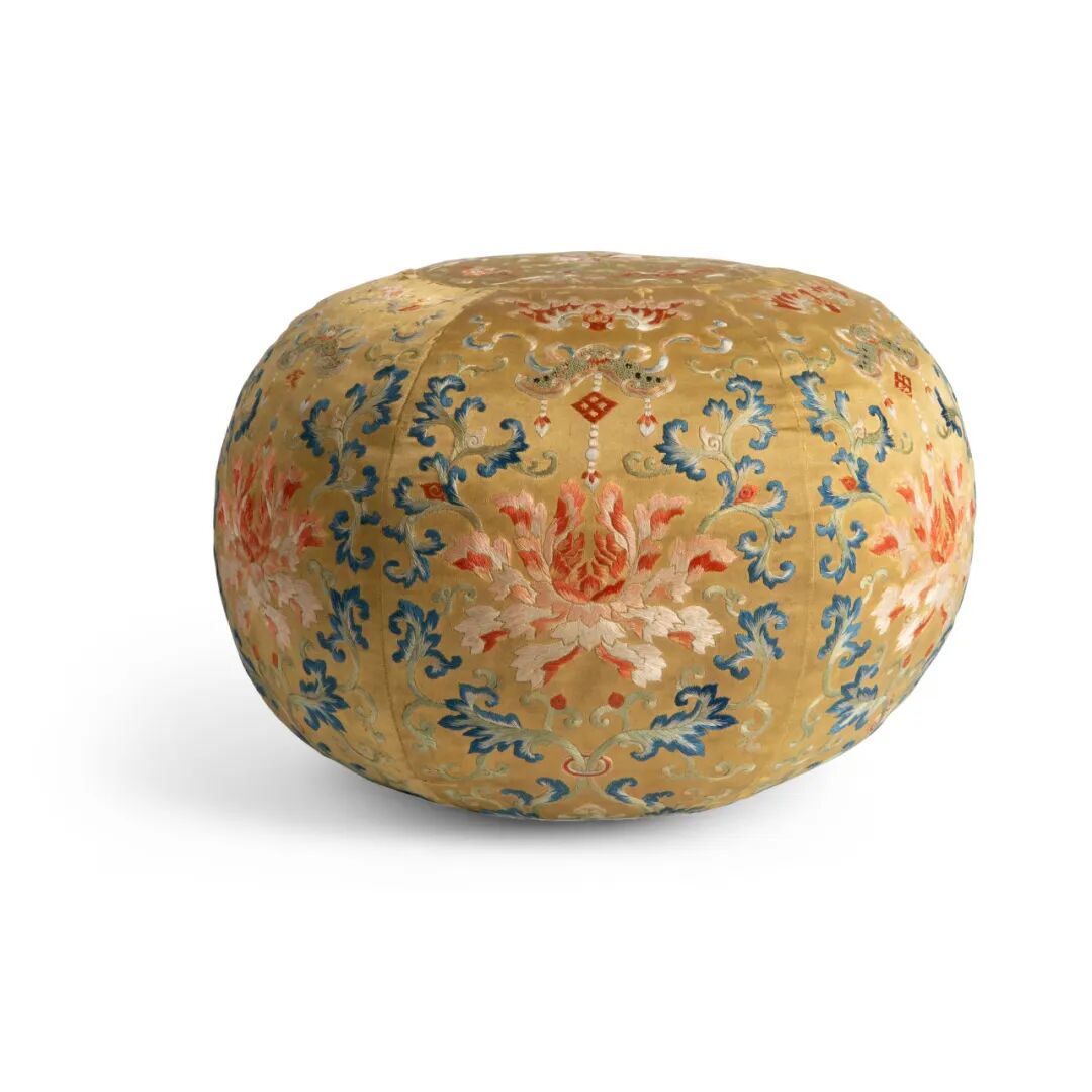 来源:已故英国工党下议院议员阿伦·坎贝尔一等勋爵士(Sir Alan Campbell,GCMG,2010-2021)旧藏,后家传,英格兰皇家利明顿温泉区。1.此迎手或由阿伦·坎贝尔爵士于1956-57 年在北京担任英国大使馆馆长期间获得。或由其父亲休·坎贝尔(Hugh Campbell,1873-1943 ),于二十世纪初在上海任做丝绸交易兼任Ilbert & Co董事期间获得。休·坎贝尔于 1905 年与时任英国驻上海总领事佩勒姆·沃伦爵士(Sir Pelham Warren,1845-1923)的女儿埃塞尔·沃伦(Ethel Warren,1881-1951)在上海结婚,此迎手亦有可能为当时结婚贺礼。休·坎贝尔在第一次世界大战后退休到英国,但在1920至30年代期间多次往返中国,企图在大萧条时期挽救其面临倒闭的公司。2.此明黄地饰渐蓝及红色刺绣迎手或为清宫用品。维多利亚和阿尔伯特博物馆藏有类似清代(1780-1850)迎手一对,馆藏号:FE.138A-1983;另一对清代18-19世纪的迎手售于纽约苏富比,2021年9月29日,拍品948,可资比较。