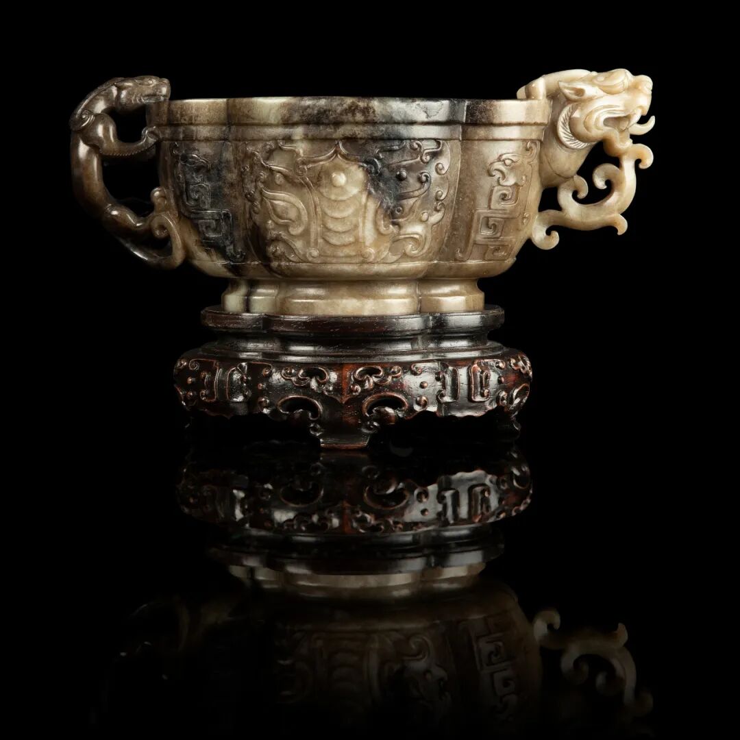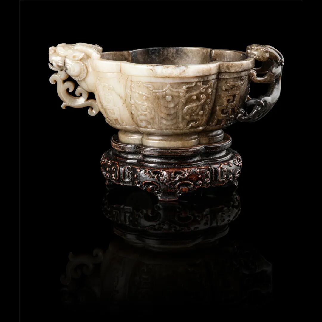 Lot 126 明 白玉提油仿古饕餮纹倭角海棠式龙首杯