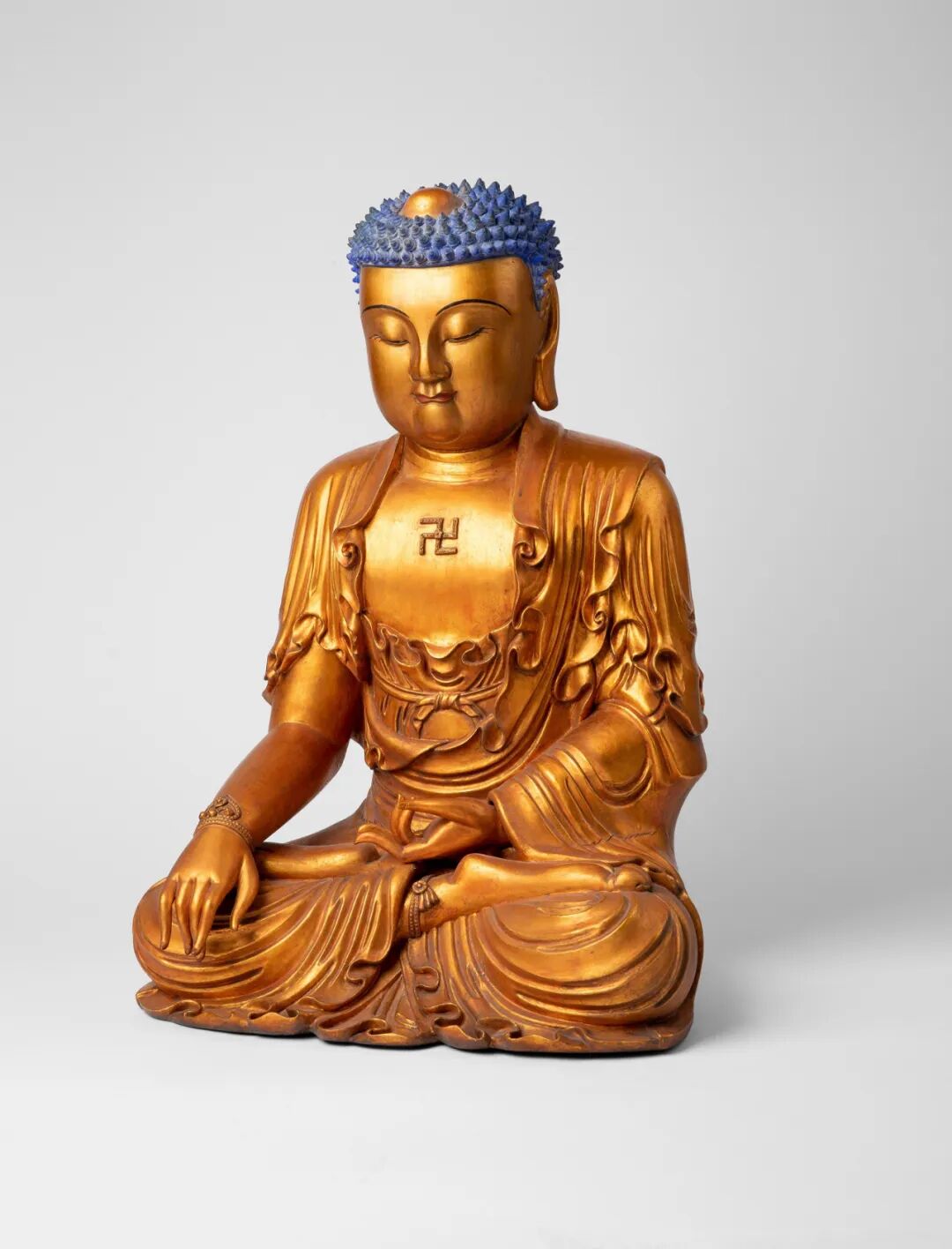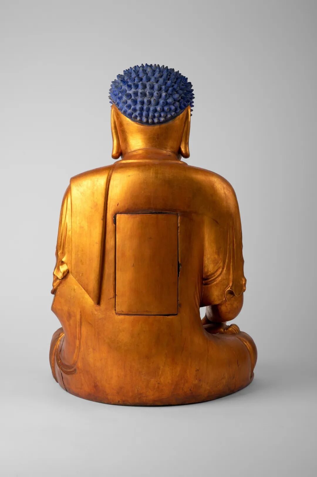 注:一尊尺寸及形制高度相似的明代漆金木雕释迦牟尼佛座像,售出于台北罗芙奥,2017年6月3日,拍品624,可资比较。