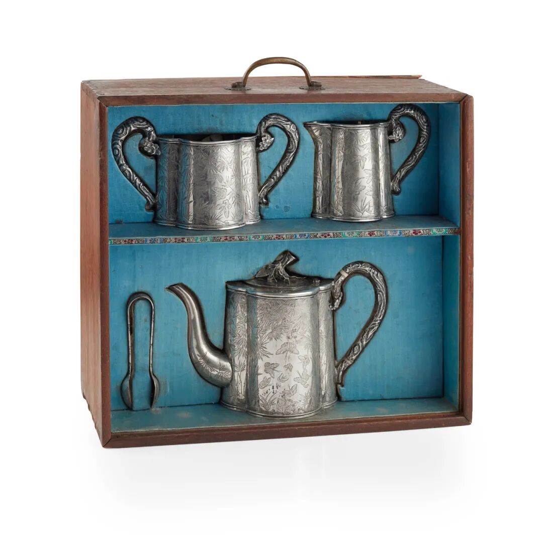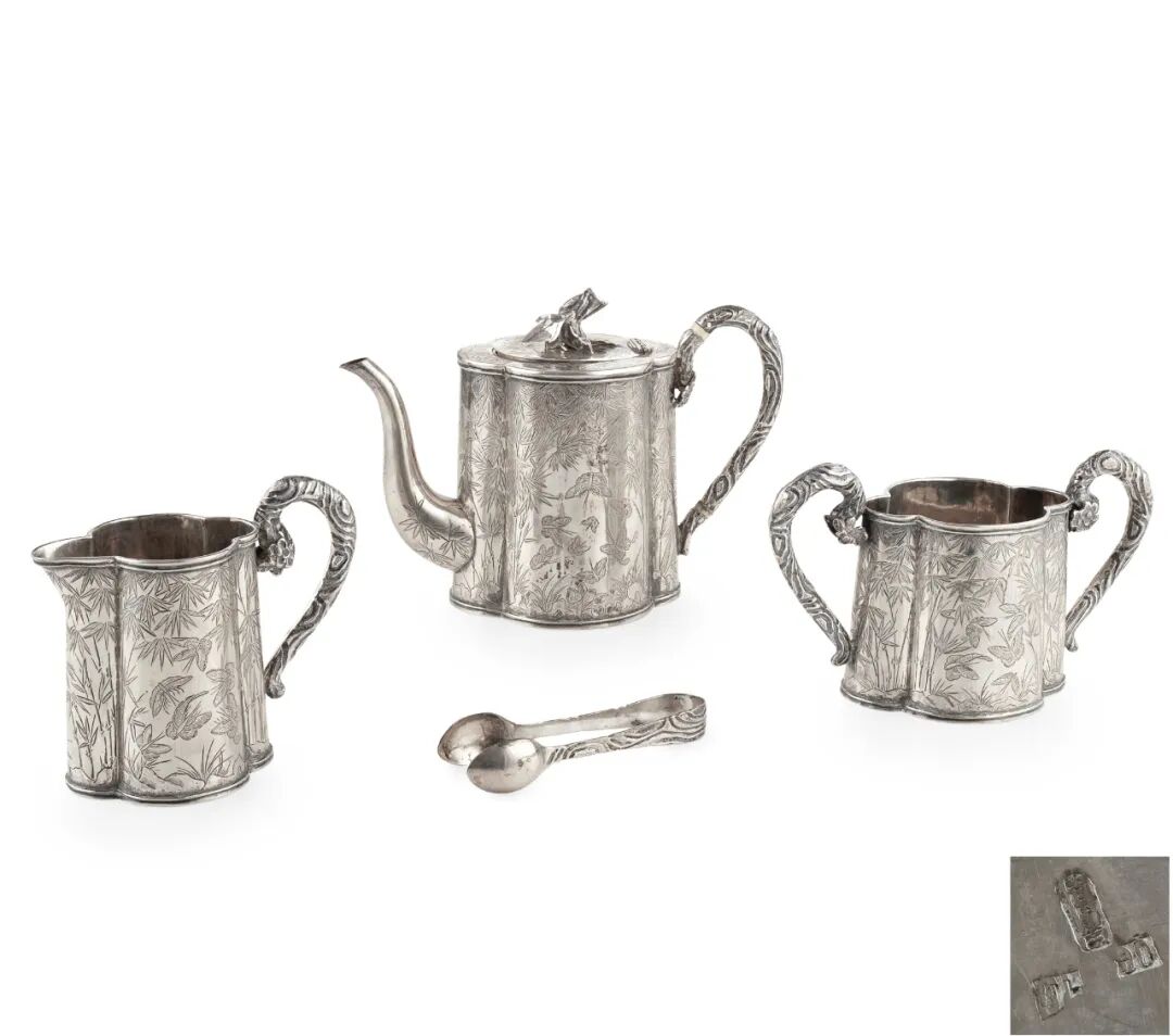 Lot 37 清末民初 「慎昌」、「90」、「70」款 外销银竹林舞蝶图海棠形茶具一组四件(带原盒)尺寸:茶壶高15cm,净重529克 ;奶壶高12cm,净重224克 ;糖罐高11cm,净重229克 ;夹子长11.7cm,净重43克